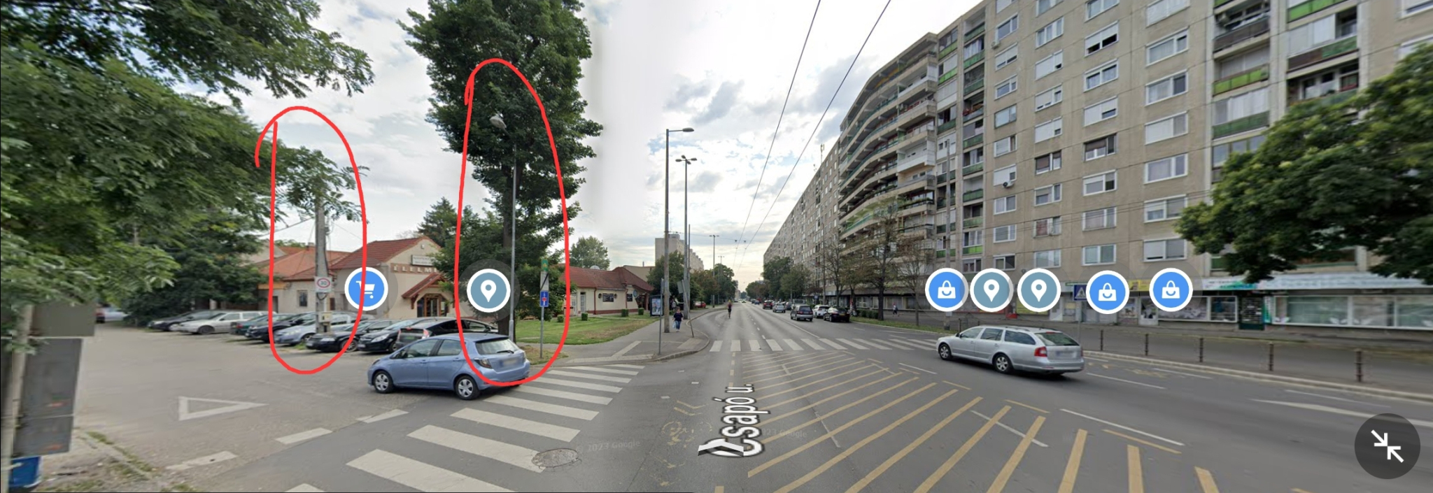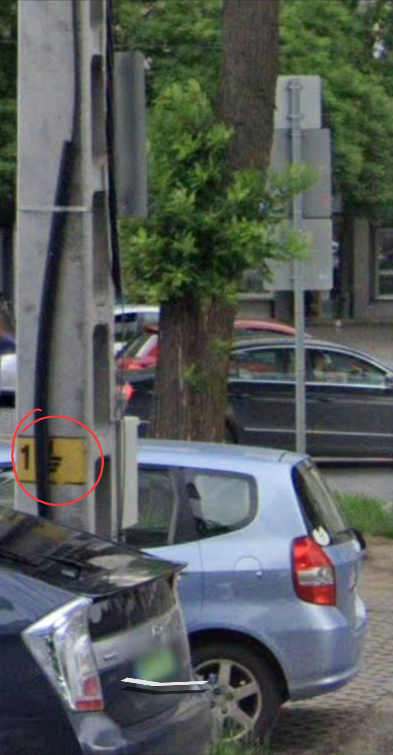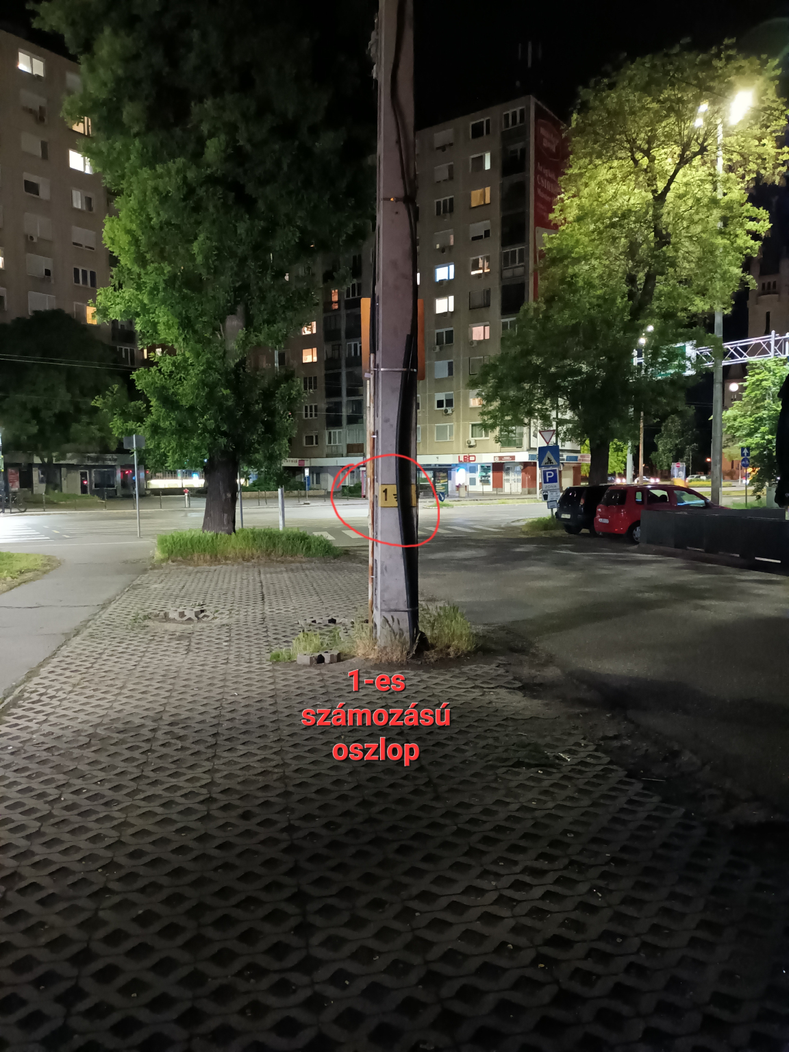 A legelső oszlop egy földkábeles oszlopszám nélküli lámpaoszlop, a másik mellette lévő oszlop egy 1-es számozású, földelés jellel ellátott áttört gerincű légkábeles beton oszlop.