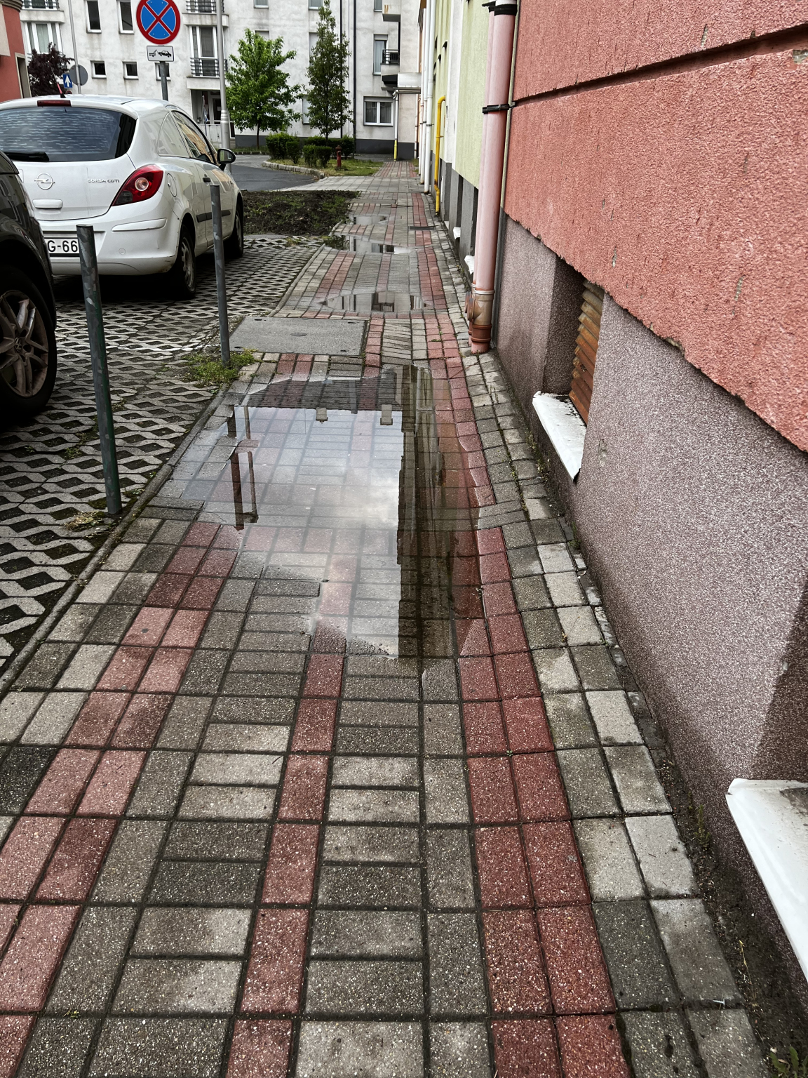 Továbbá a csapadékvíz elvezetése sincs megoldva: eső esetén nagy mennyiségű víz gyűlik össze a járdán, ahogy az a mellékelt képeken is jól látható.