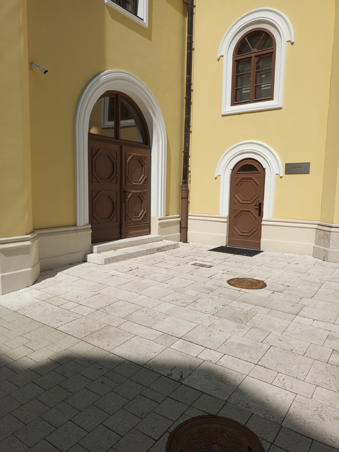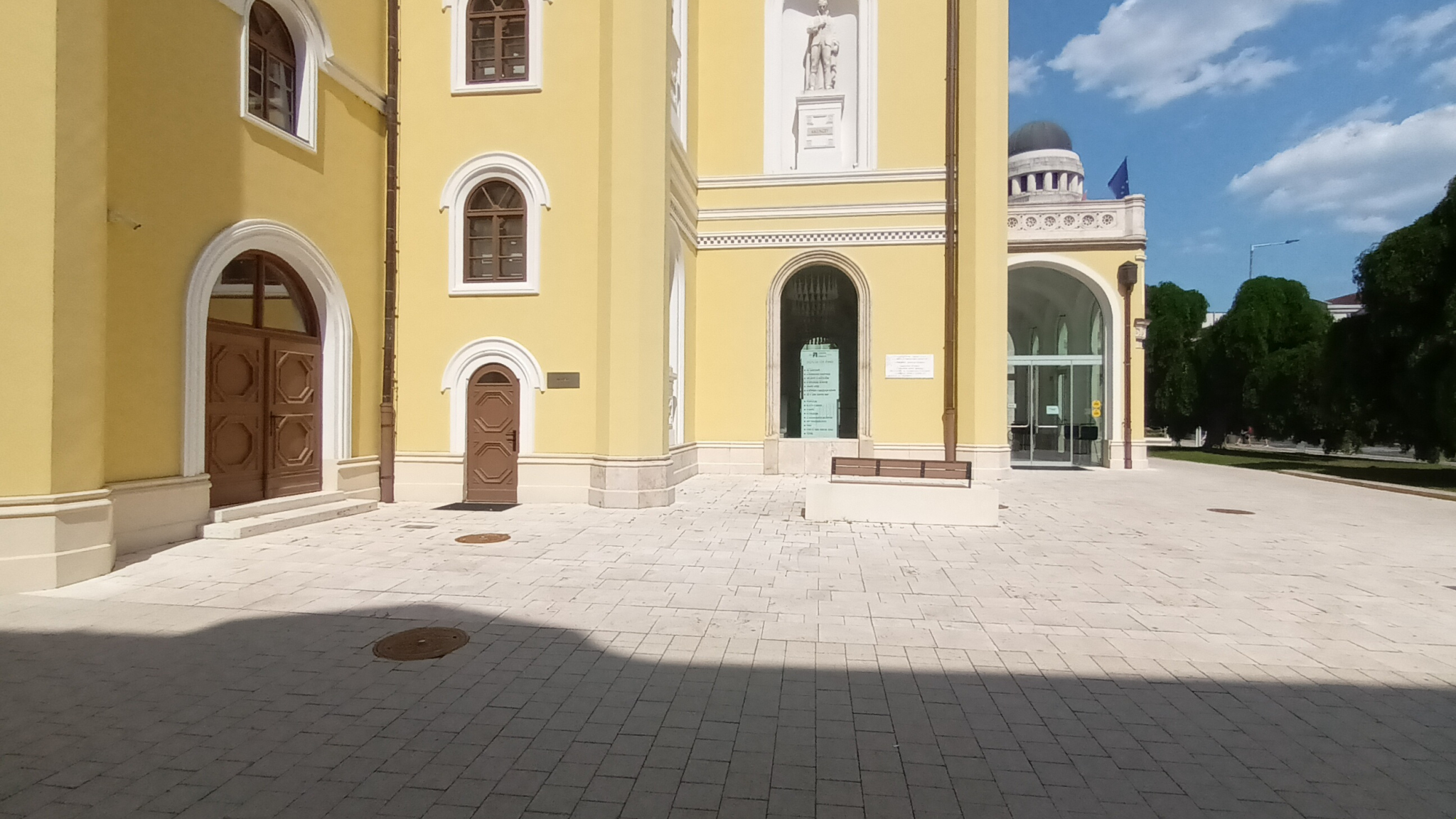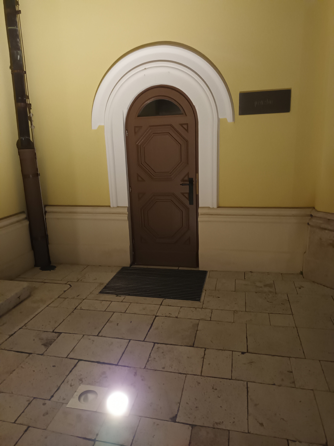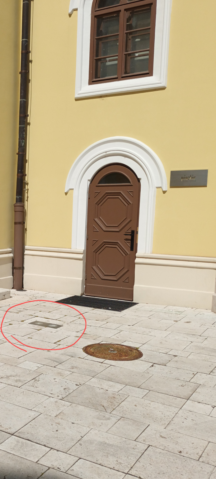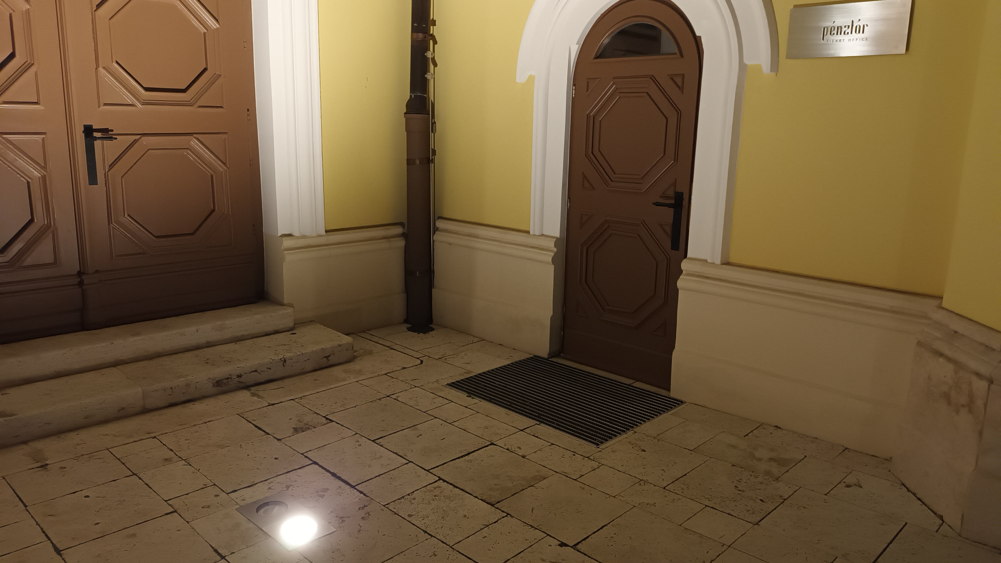 A Csokonai Színháznak a Liszt Ferenc utcára néző oldalán a kicsi magasságú egy szárnyas ajtó előtti talajba süllyesztett lámpatest nem világít.