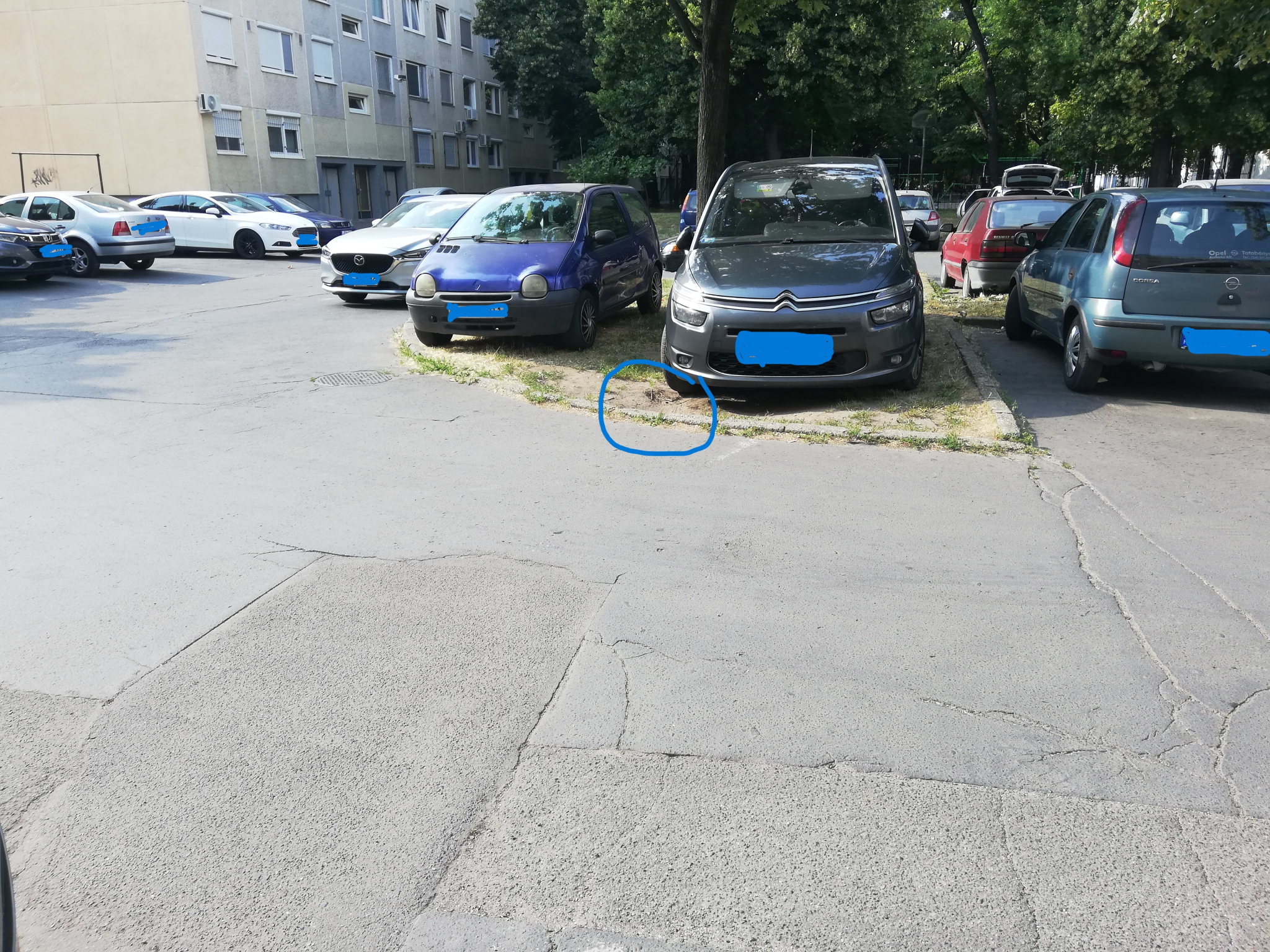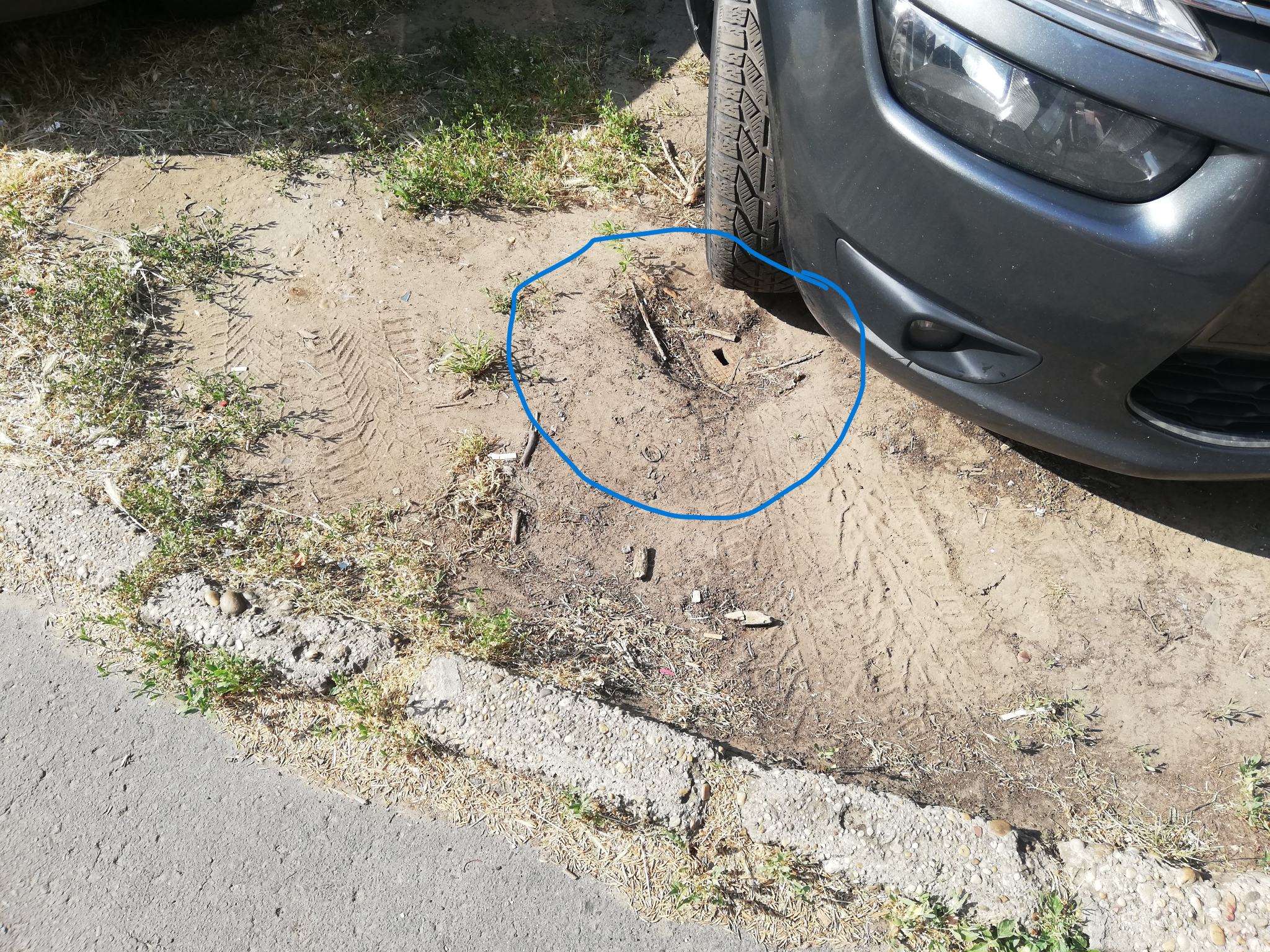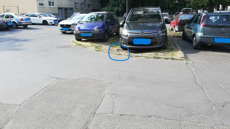 A Debrecen, Kandia zsákparkolóban az egyik zöldterületen a közterületi gázcsap elzárón nem csak áthajtanak gépjárművel, hanem parkolnak is a rajta.