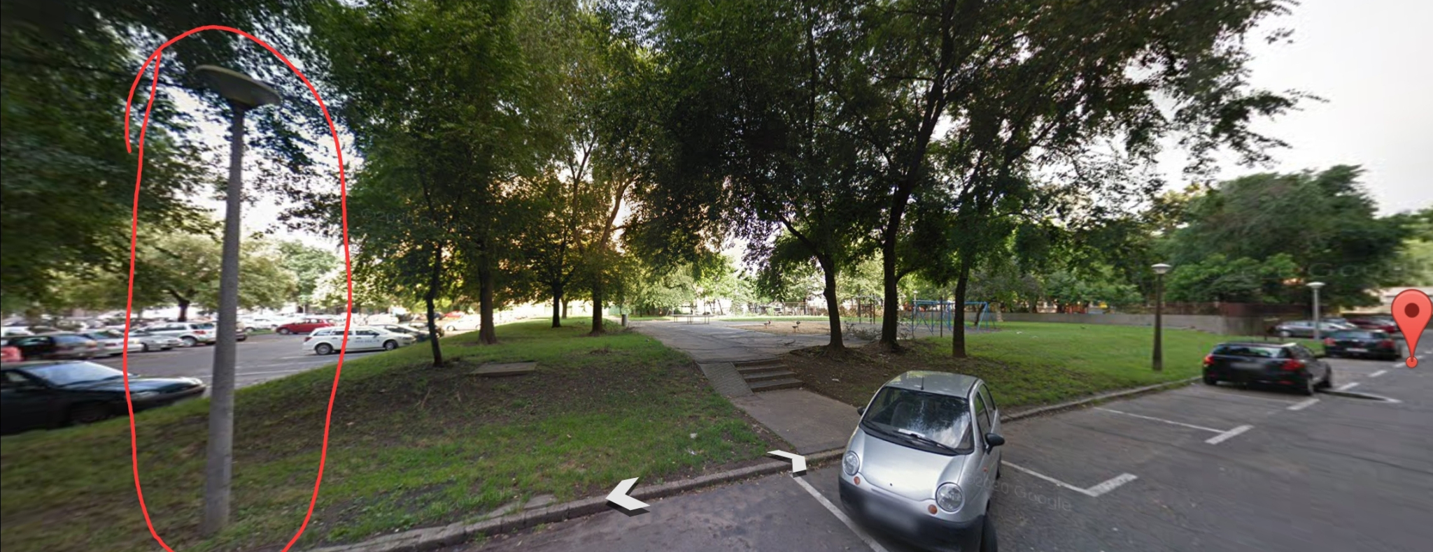 Ez a lámpaoszlop a Darabos utca 10. szám alatti lépcsőház hátsó, 3 részre osztott, szürkére festett bejárati ajtajától nem messze a játszótér közelében található.