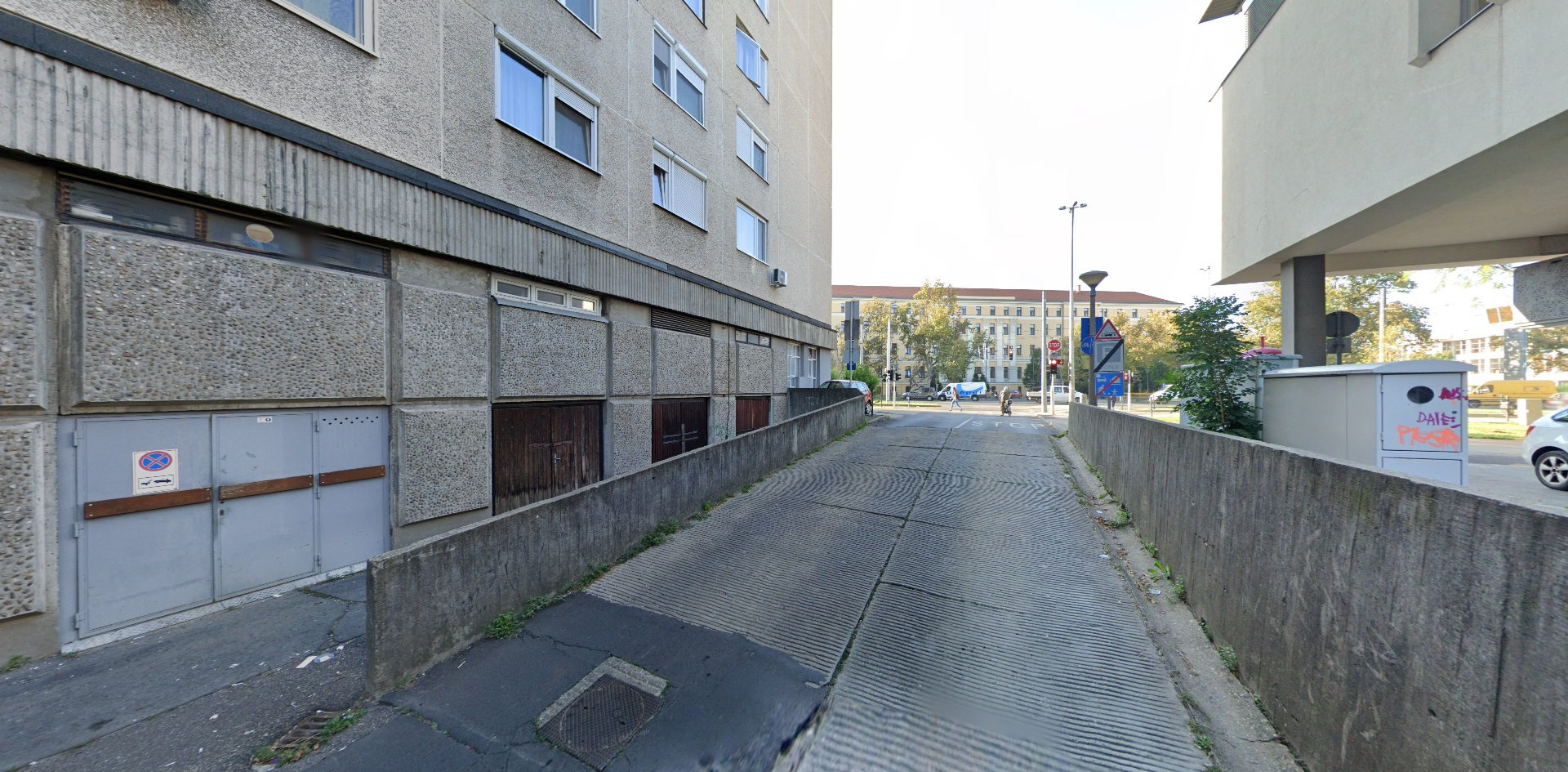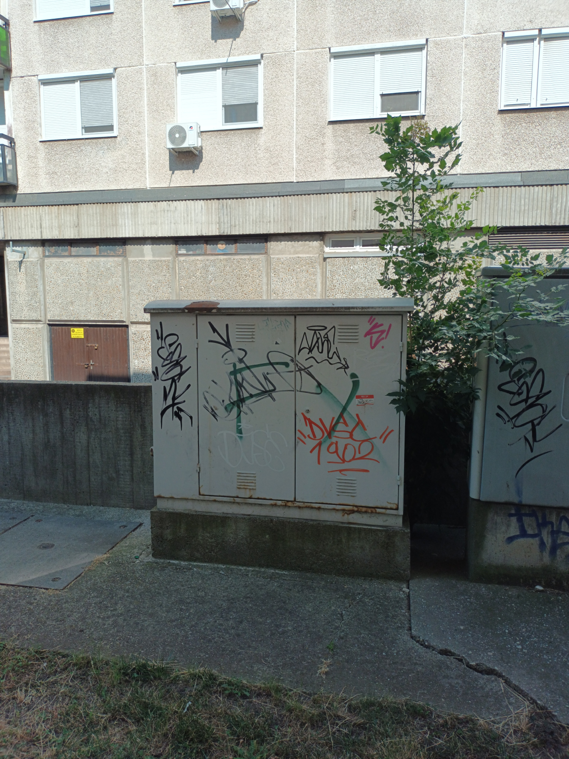 A Darabos utca 4. szám alatti lépcsőház hátsó, három részre osztott, bejárati ajtajával szemben lévő közmű szekrény össze van graffitizve és erőteljesen rozsdásodni kezdett, pereg le a festék róla.