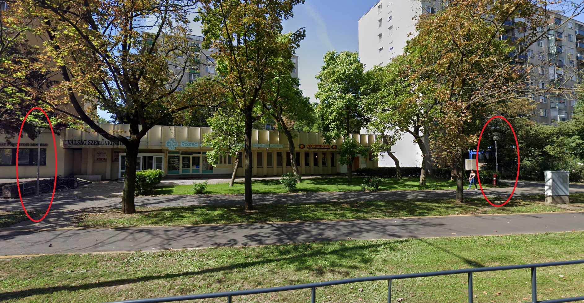 A Bethlen utca 46. szám alatti épület két vége előtt lévő lámpaoszlopok nem világítanak.