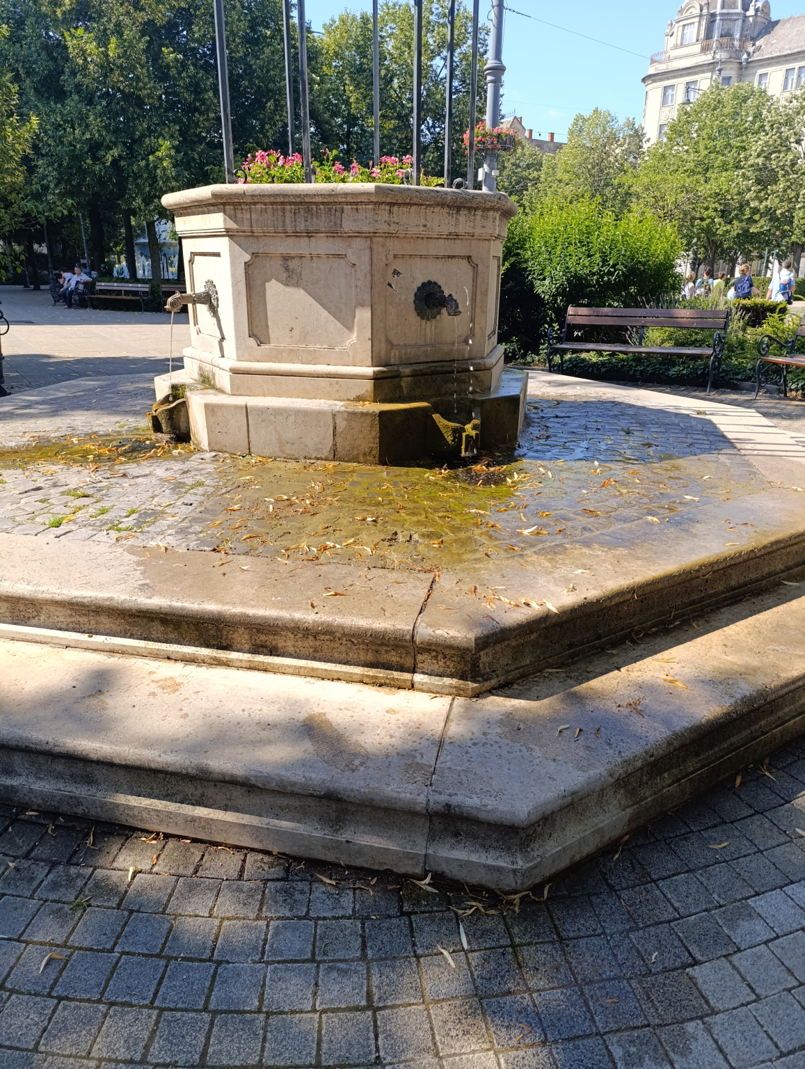 A szökőkút környékén a kifolyó víz szétterül a kövezeten, ami hosszabb időn át nedvesen tartja azt, és az algás felület csúszóssá vált