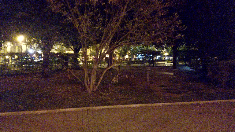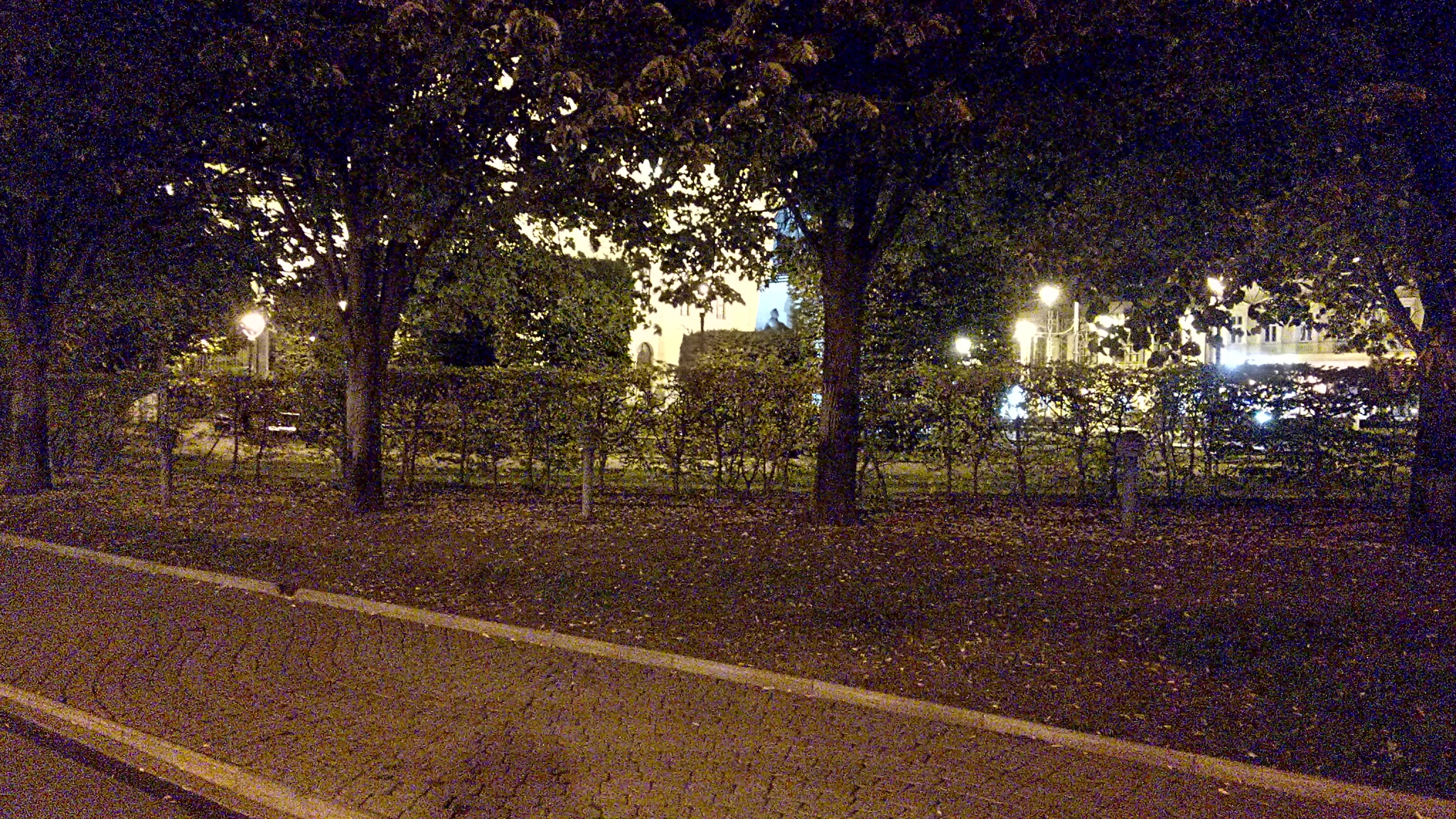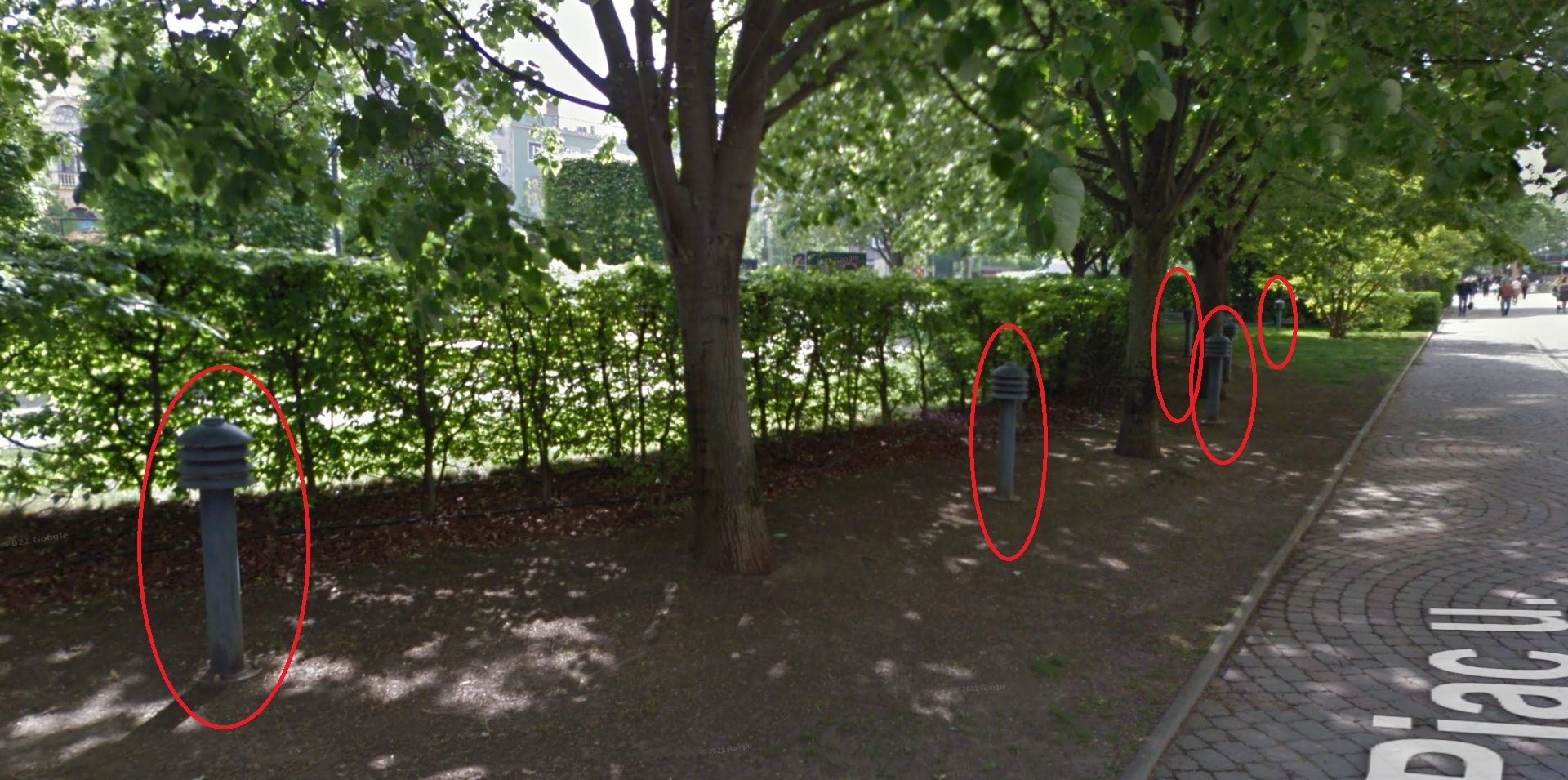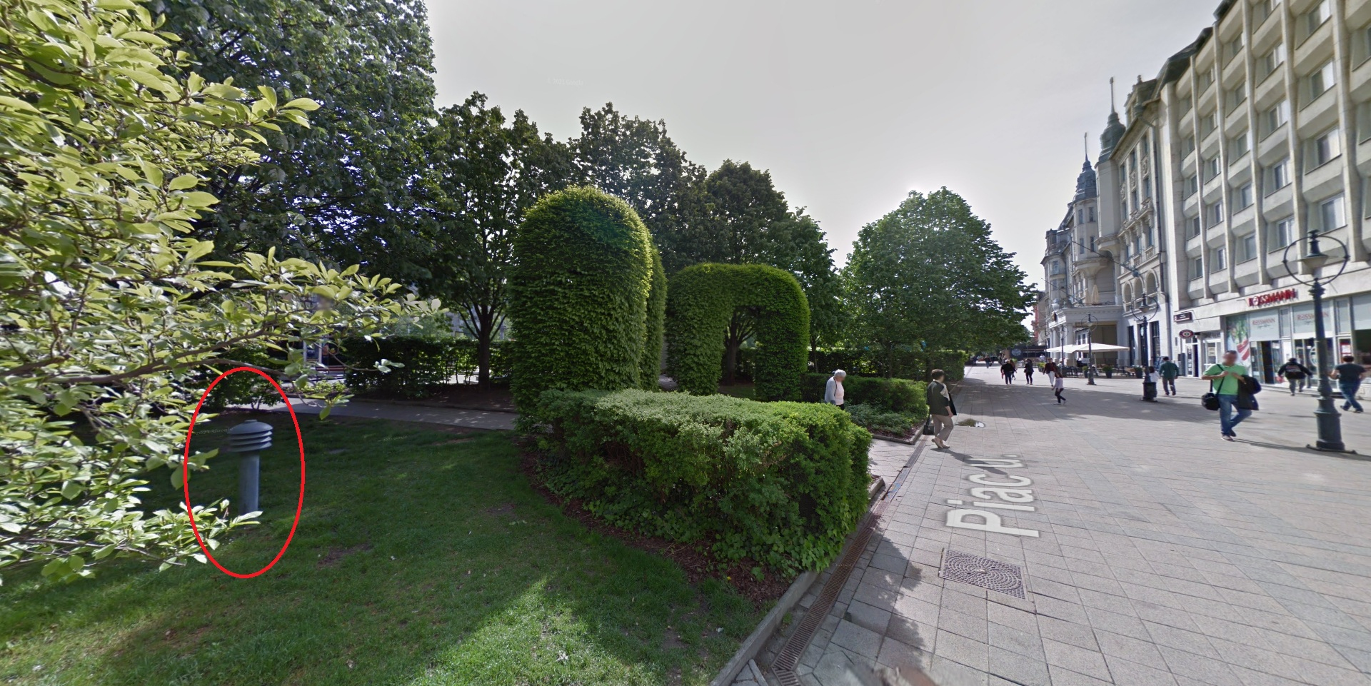 A Piac utca 1-3. szám alatti épületekkel szemben lévő zöld-füves területen lévő növényzet megvilágító lámpatestek közül egyik sem világít.