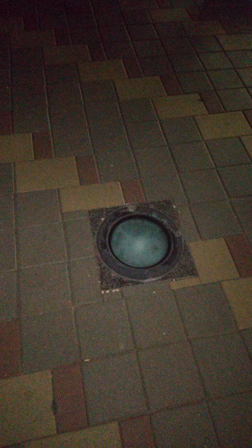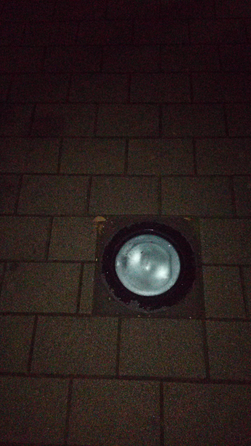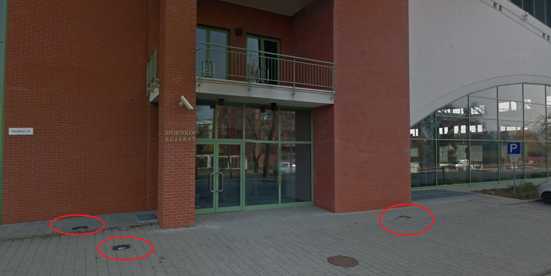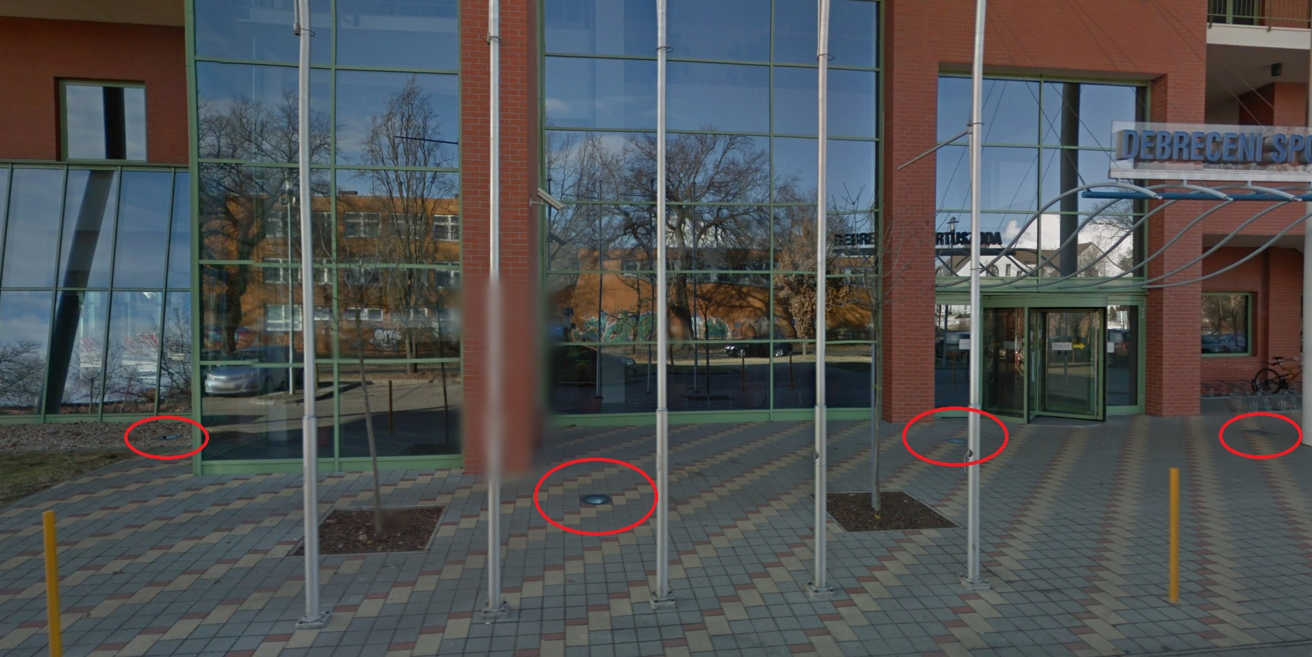 A Debreceni Sportuszoda épületének a Zákány utcára és a Hadházi útra néző oldalain az épület körüli talajba süllyesztett lámpatestek nem világítanak.