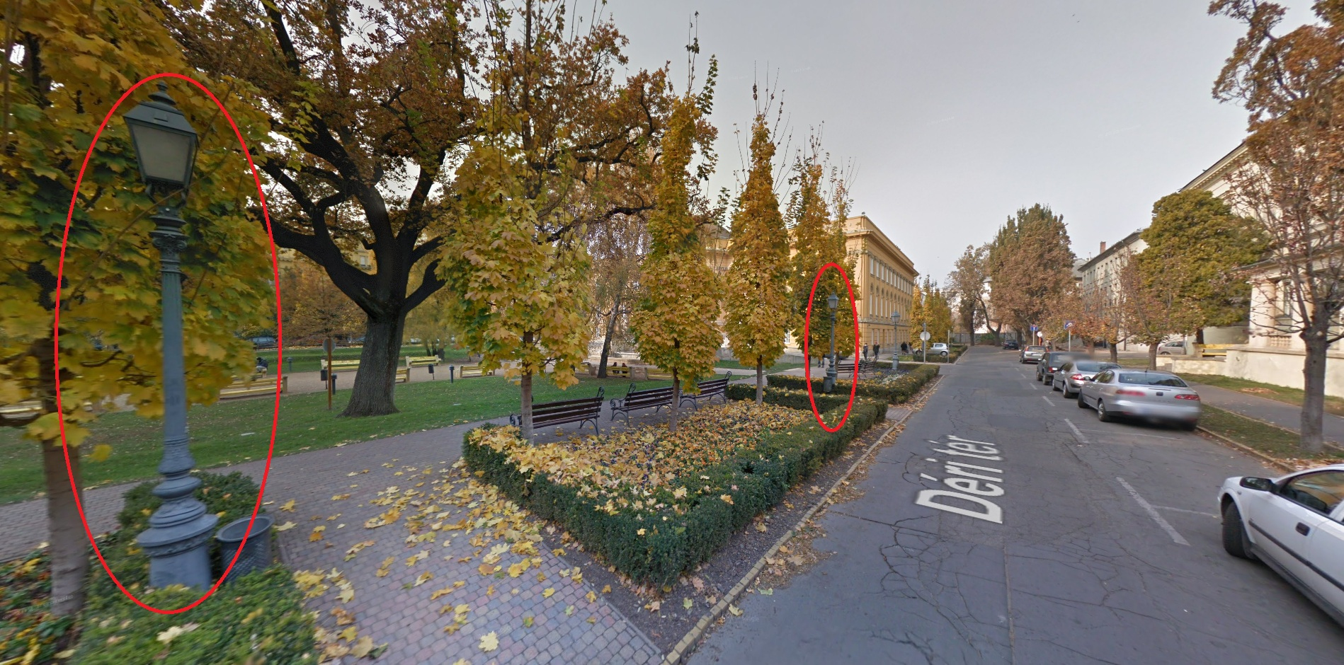 Déri téri süllyesztett park melletti járda melletti lámpaoszlopok közül két egymásutáni lámpaoszlop indokolatlanul elsötétült egyszerre 2025.08.04-én kb. 23:25 körül valószínűleg hirtelen fellépő kábelszakadás vagy zárlat miatt és azóta se világítanak.