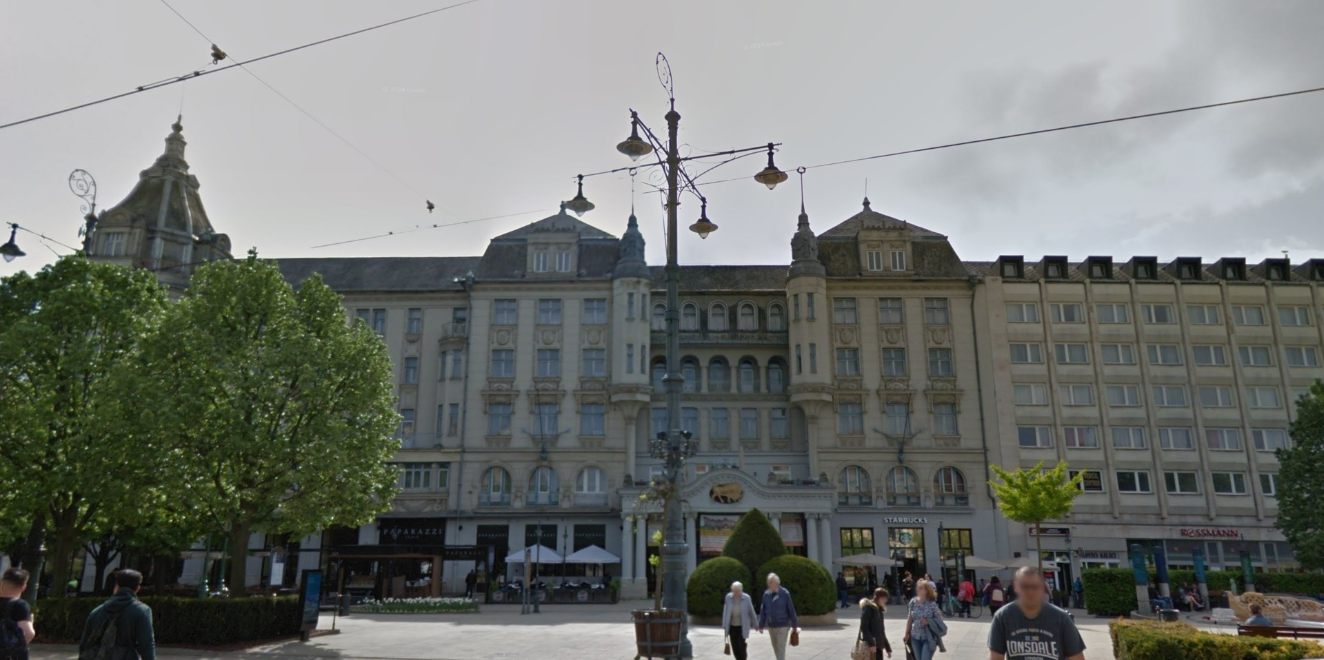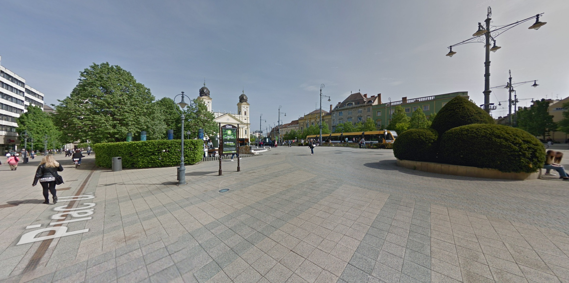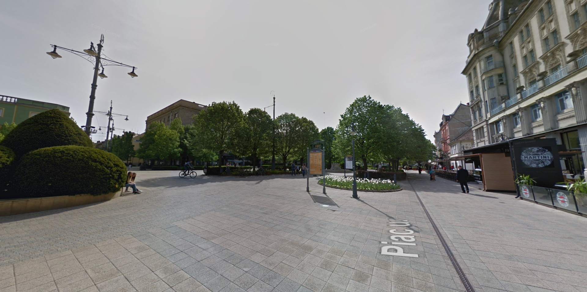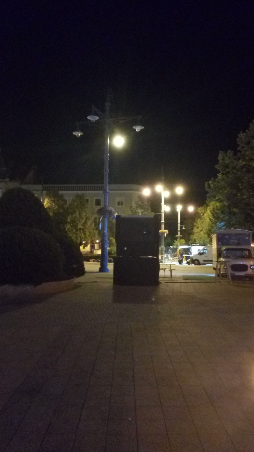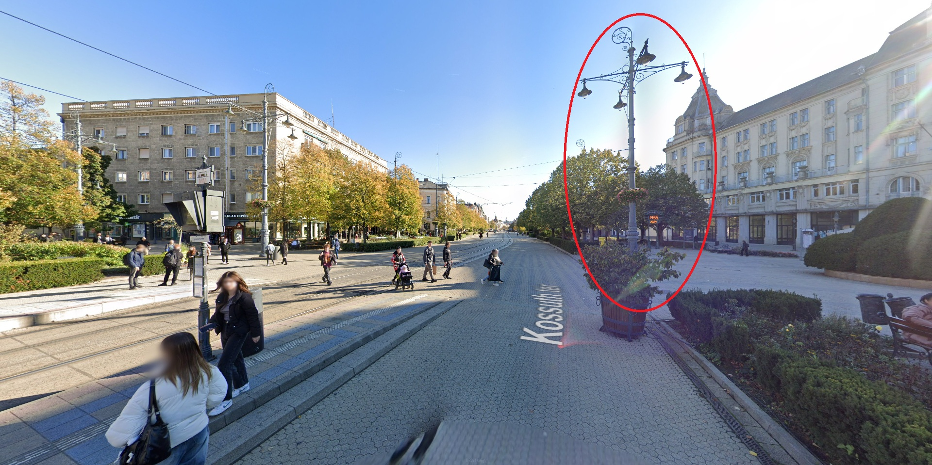 A Piac utca 11-15. szám alatti volt Hotel Aranybika, most MCC, épületétől nem messze lévő magas, négy lámpafejes lámpaoszlopnak nem világít 3 lámpafeje.