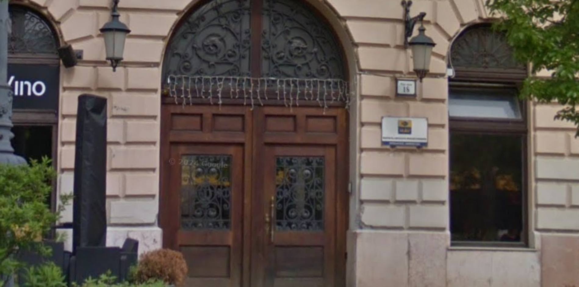 Ez a lámpaoszlop az épület Piac utcára néző oldalának a nagykapus bejárata közelében található.