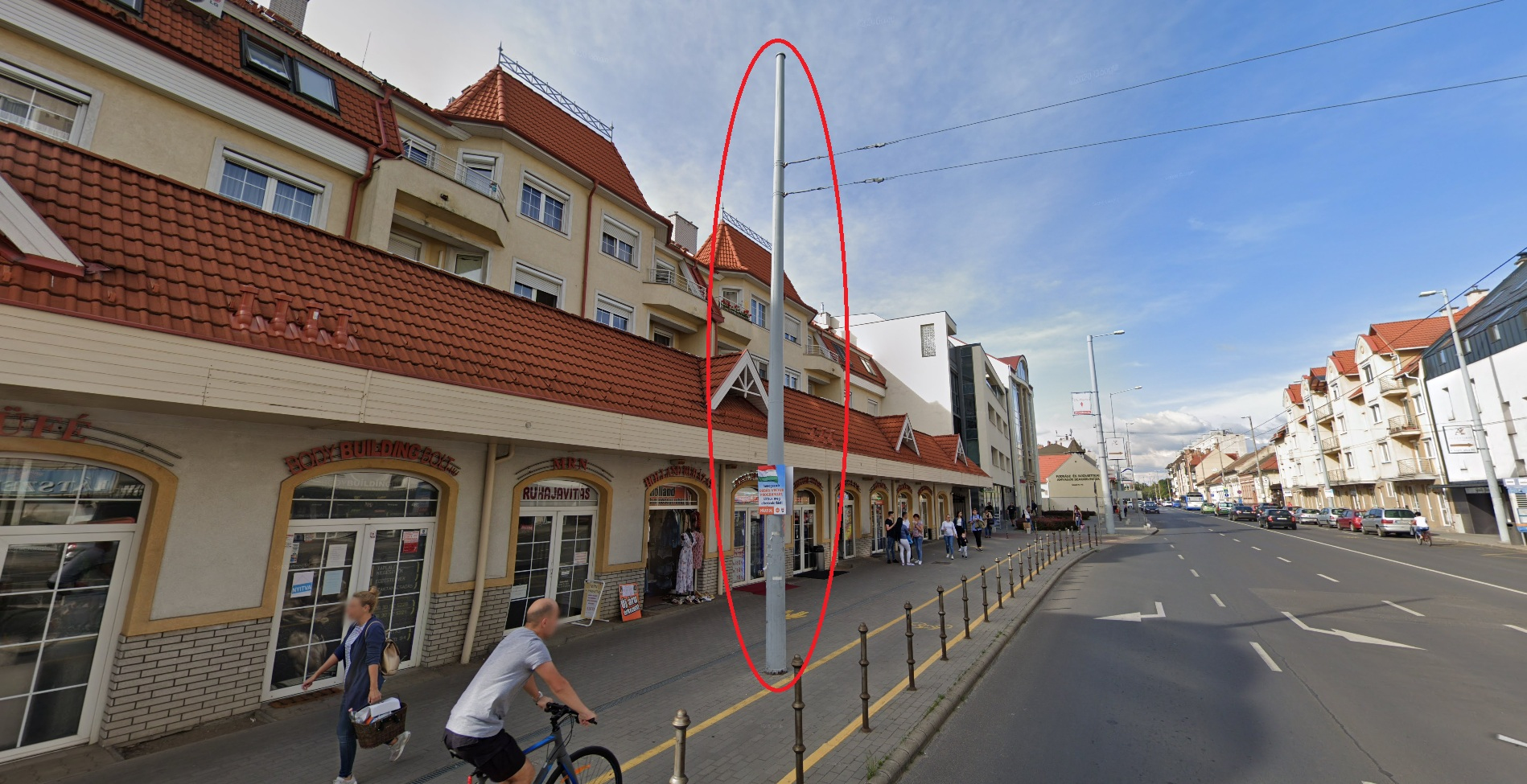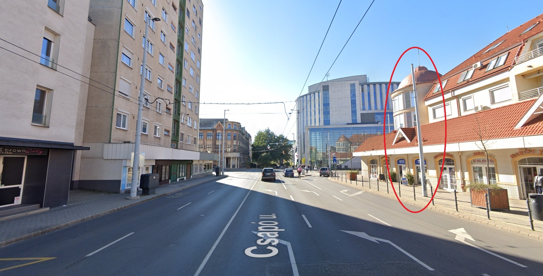 A Rákóczi utca 1-5. szám alatti épületnek a Csapó utcára néző oldala előtt lévő 93/1-es számozású trolifelsővezeték-tartóoszlopra lámpafej felhelyezését szeretném kérni, mert a lámpaoszlop kiosztás szerint pont erre a lámpaoszlopra következne a következő lámpafej és a vele szemben lévő 47-es számozású trolifelsővezeték-tartóoszlopon is található lámpafej.