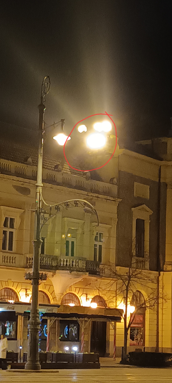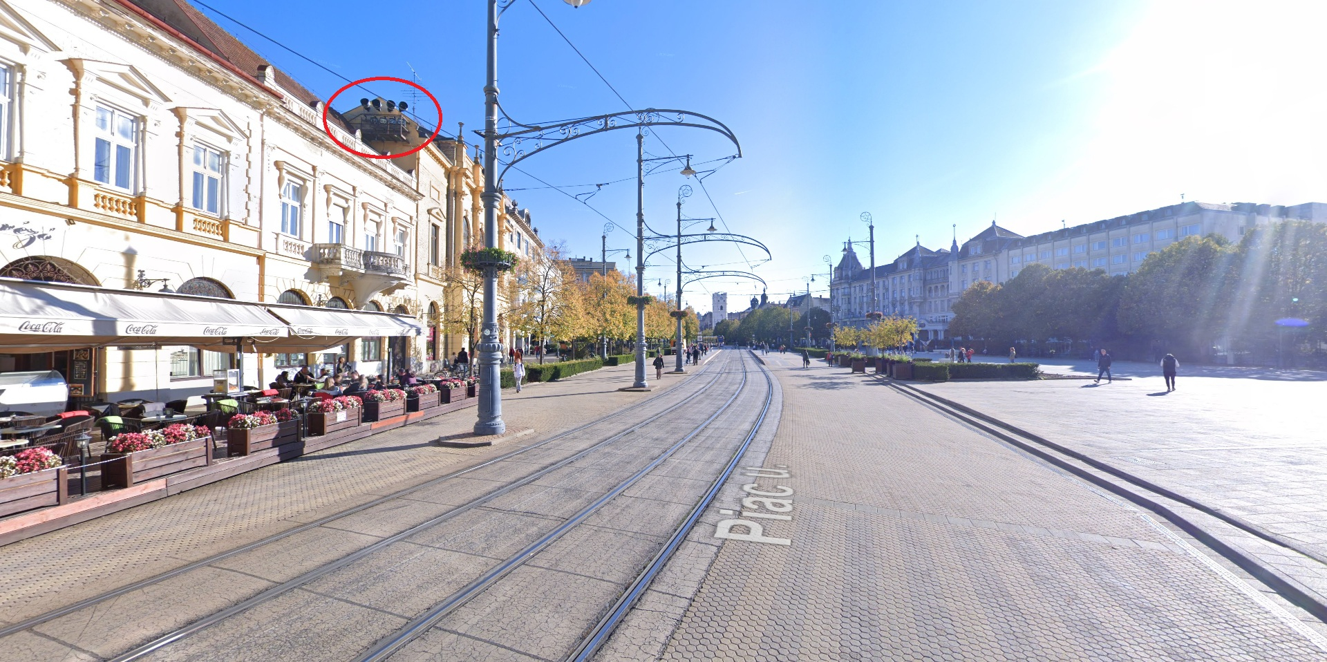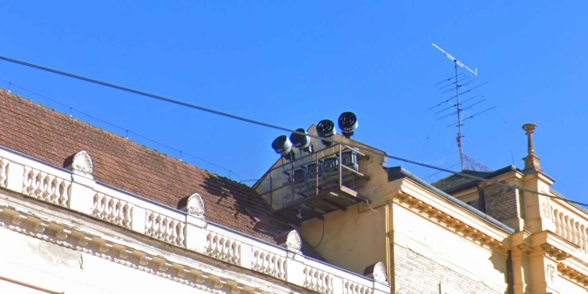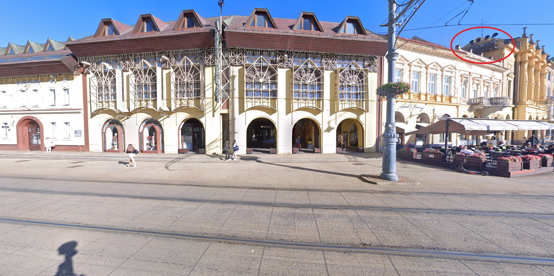 A Piac utca 8. szám alatti épület tetején lévő reflektorok ‒ amik a Nagytemplomot világítják ki ‒ hiányosan világítanak.