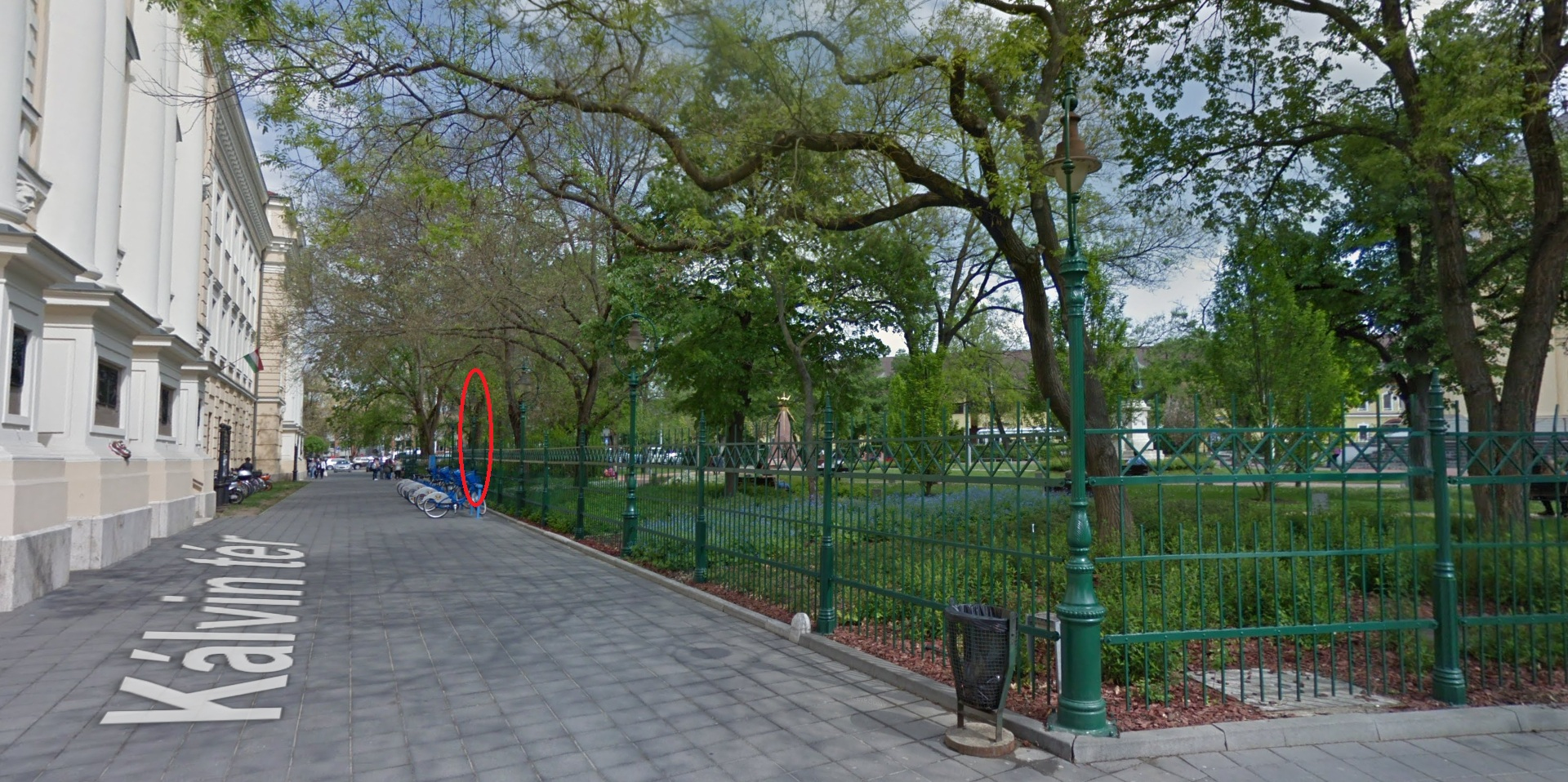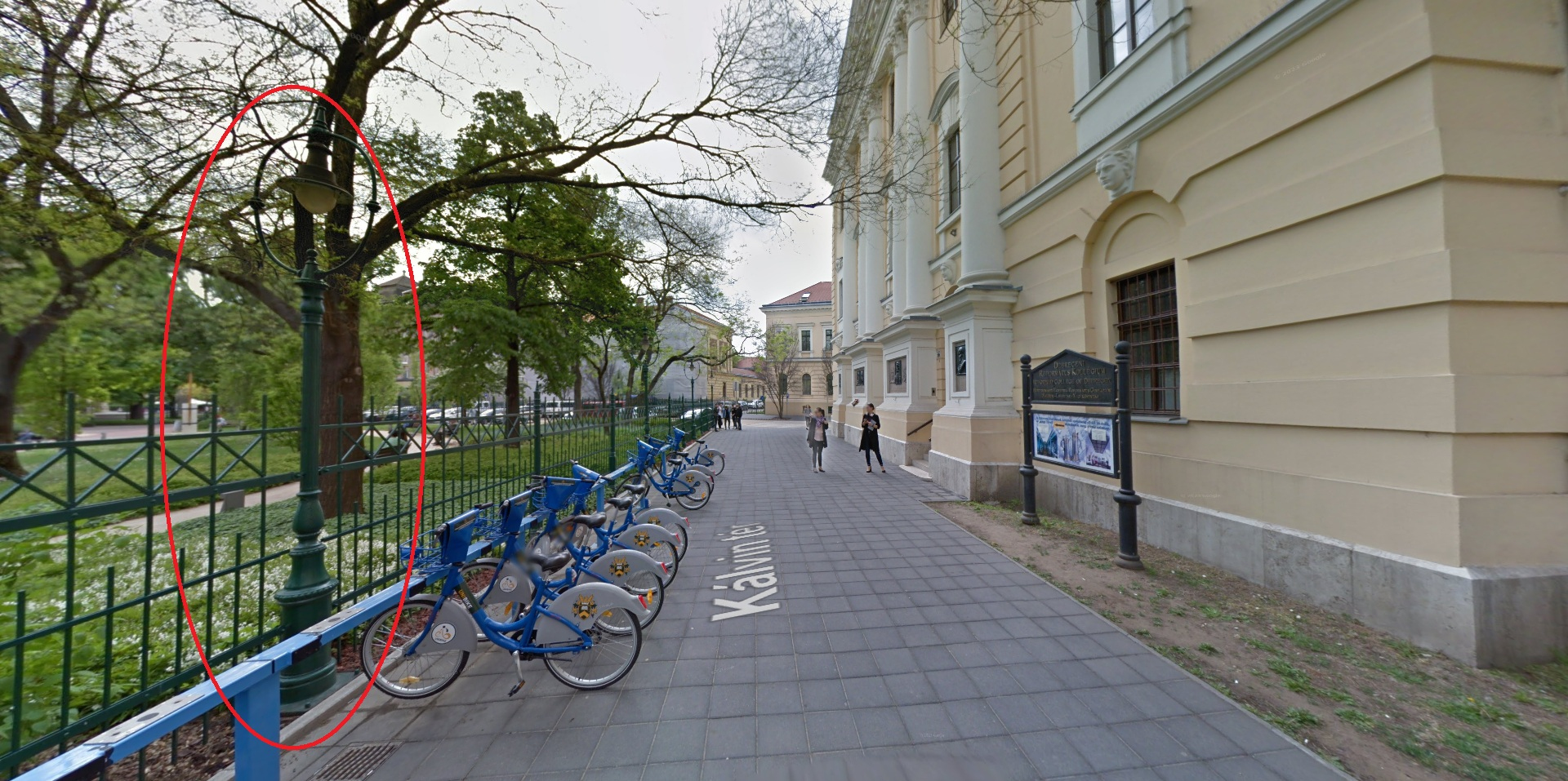 Ez a kovácsoltvas lámpaoszlop az UniBike kerékpártároló előtt és az Emlékkert kerítésének a vonalában található.