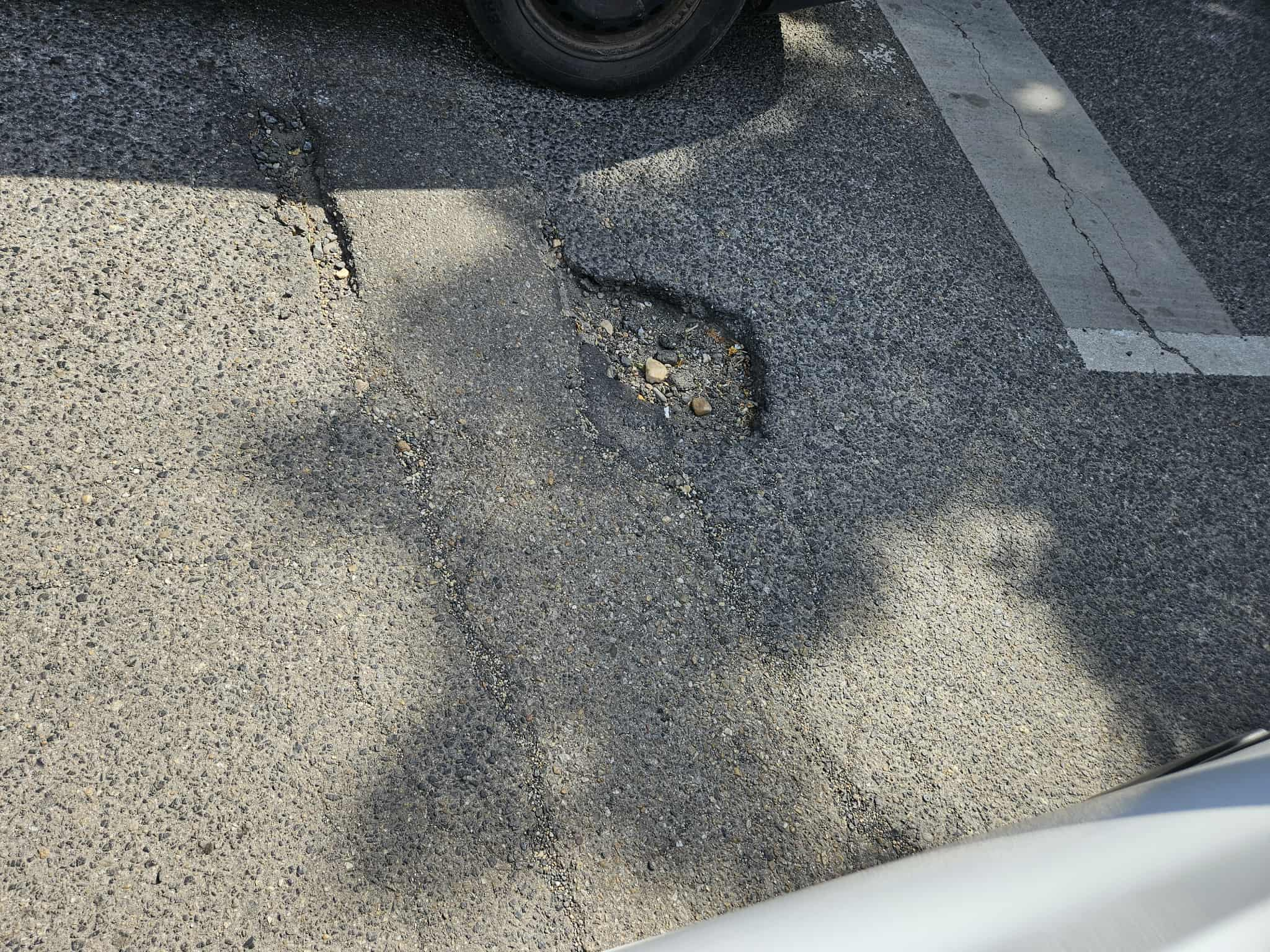 Kátyu a Szabó Pál utcán az Acsádi út felőli végén a kereszteződésben