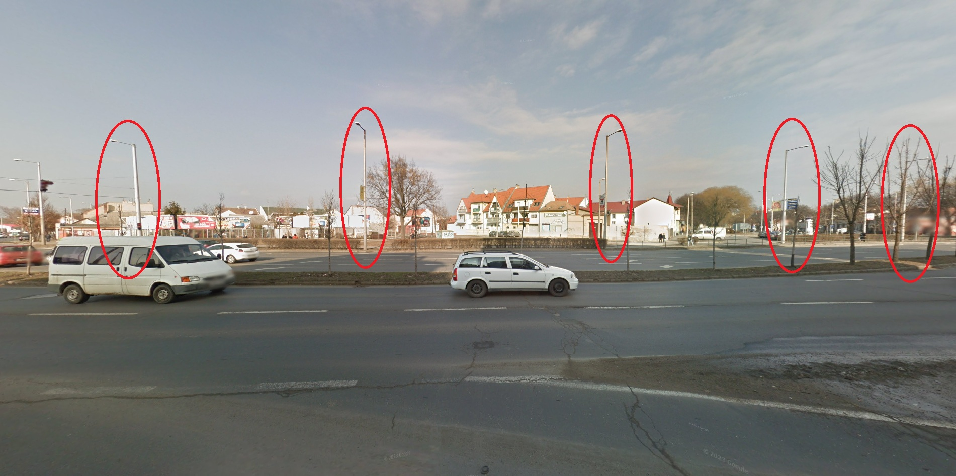 Egy panoráma képen bejelöltem a hibás lámpaoszlopokat.