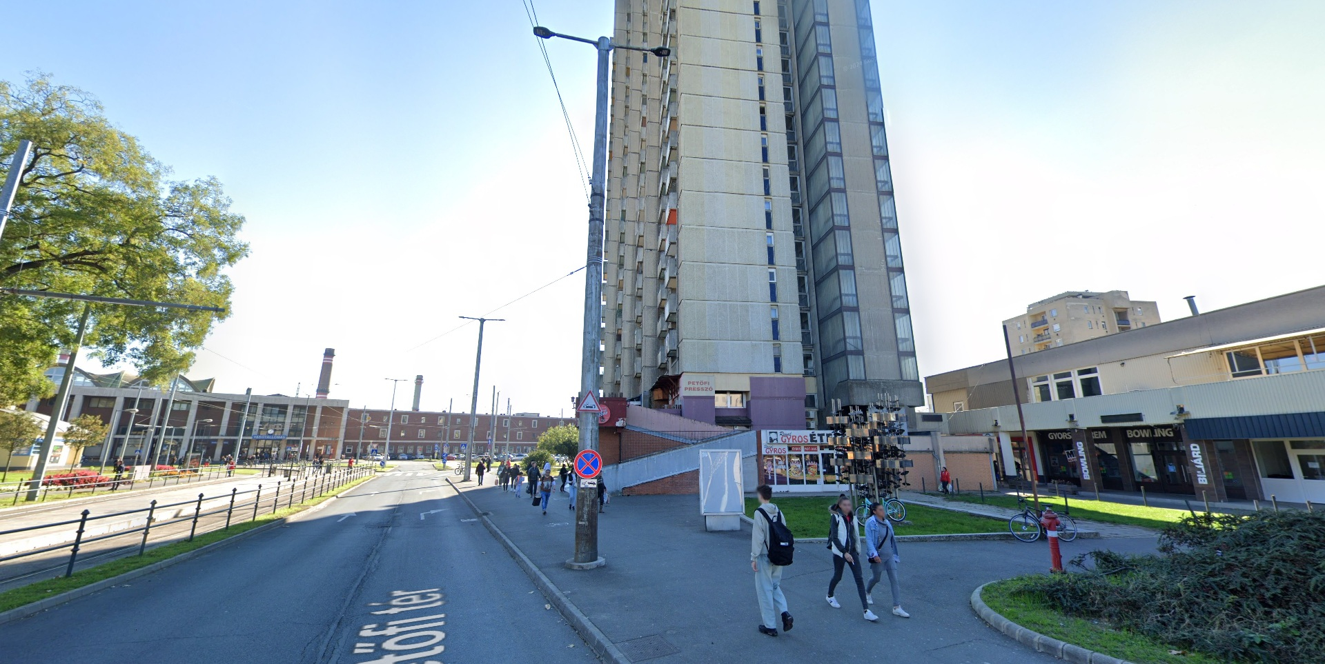 A kétkarú lámpaoszlop a 22 emeletes közelében található meg.