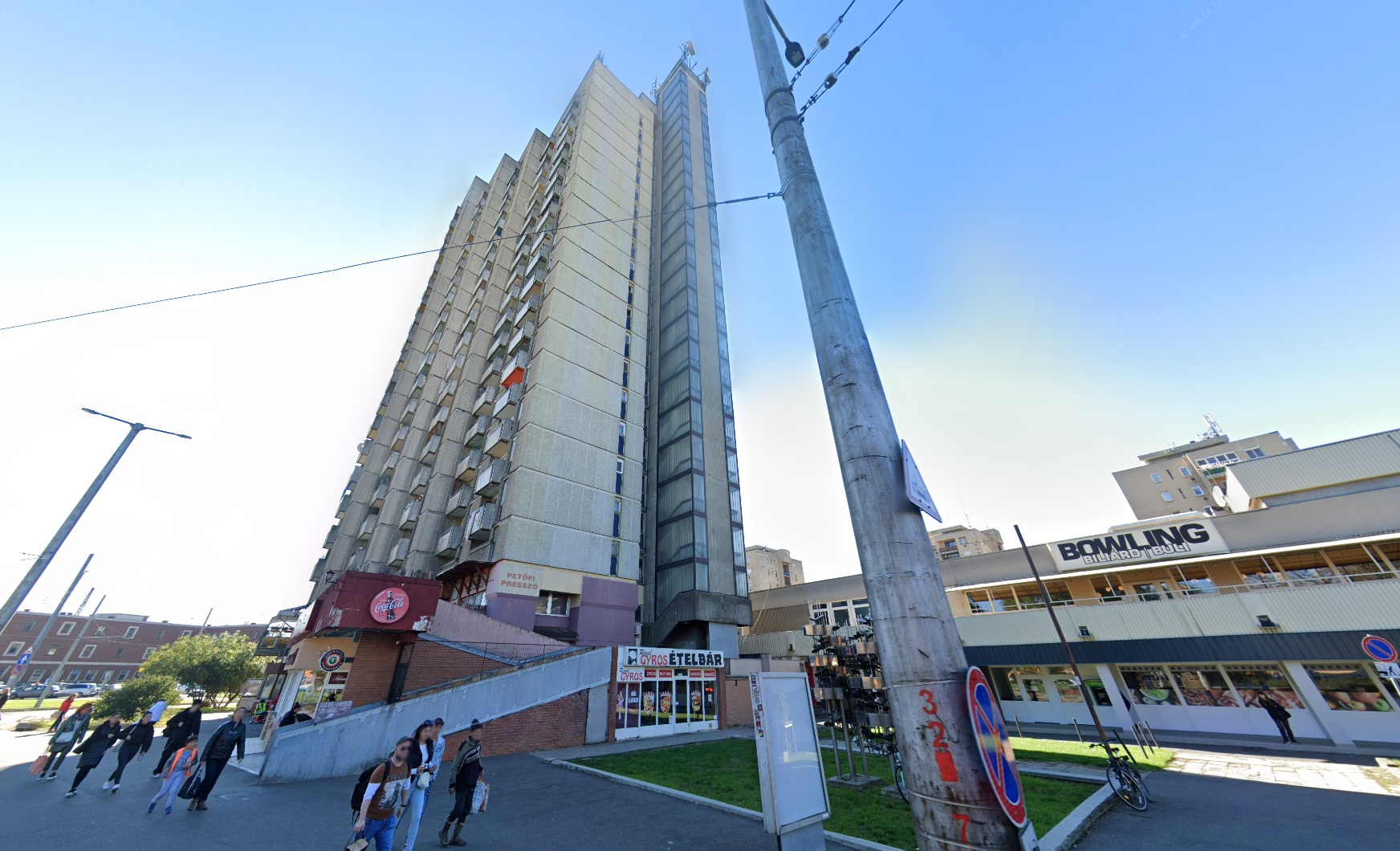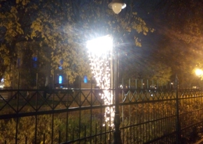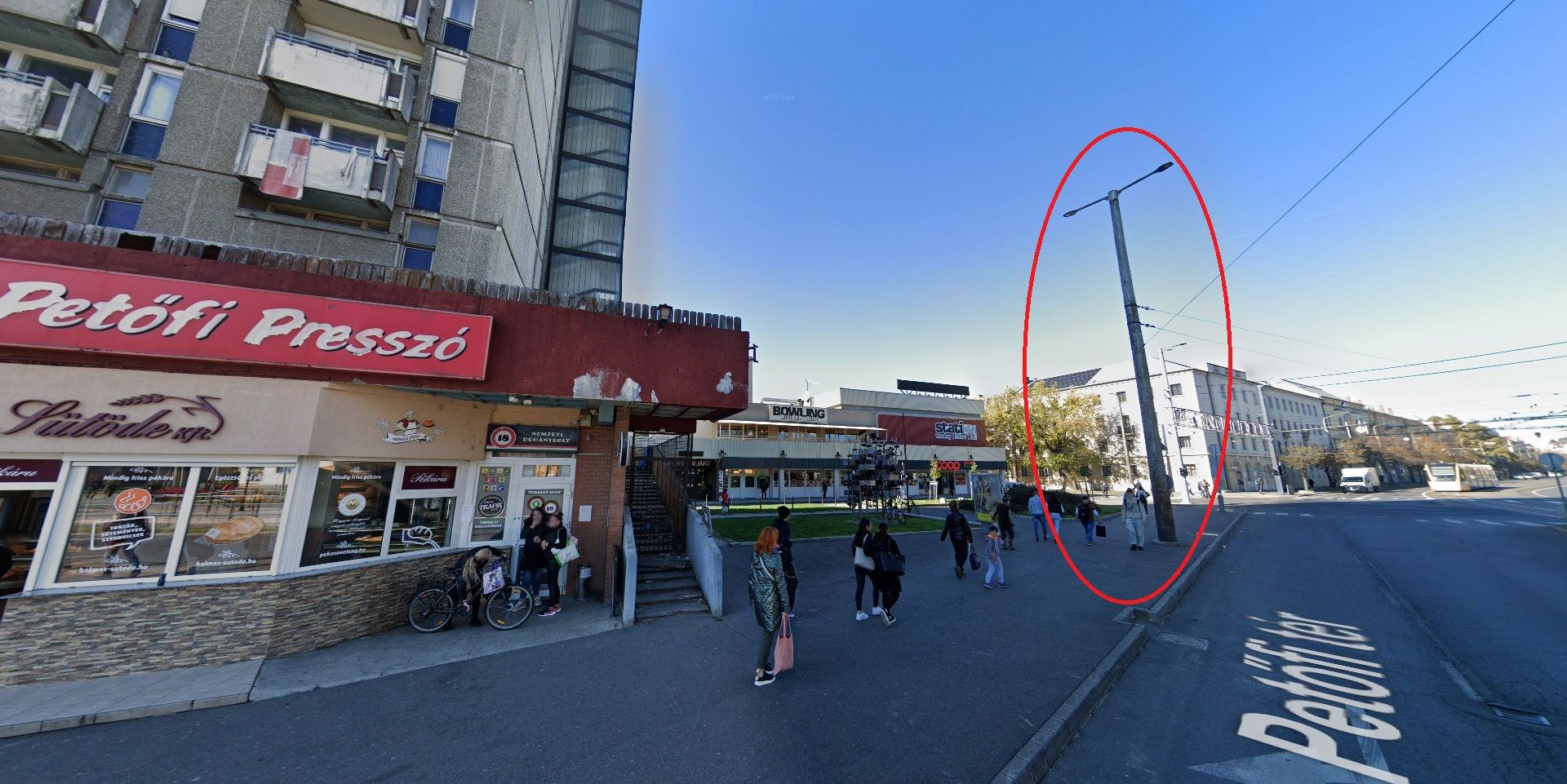 A Petőfi tér 10. szám alatti 327-es számozású kétkarú lámpaoszlop egyik lámpafeje sem világít.