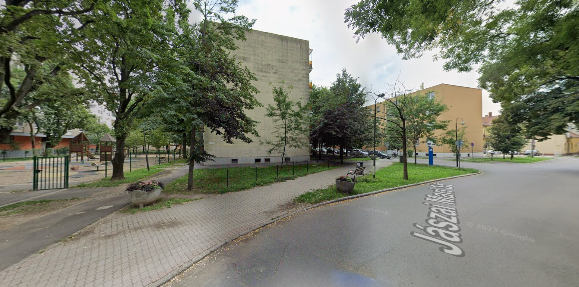 A Jászai Mari utca 5. szám alatti lépcsőház épülete mellett/közelében található lámpaoszlop nem világít.