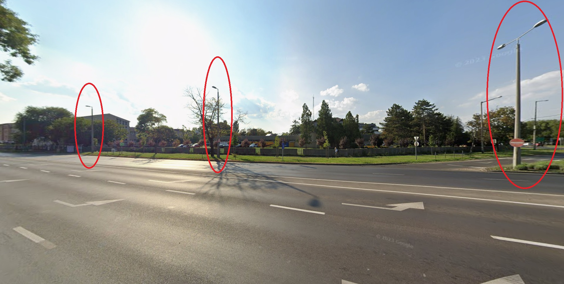 Az 1. hibás lámpaoszlop egy forgalomterelő szigeten található meg és egy behajtani tilos Kresz tábla látható a lámpaoszlopon.