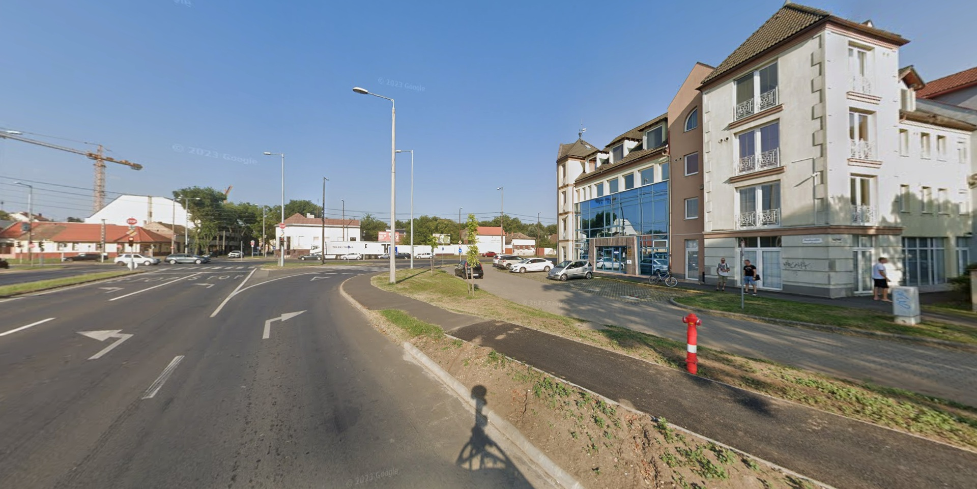 Ez a lámpaoszlop a Szoboszlói útról az Erzsébet utcára kanyarodó forgalmi sáv mellett és egy gyalogos átkelőhely közelében található.