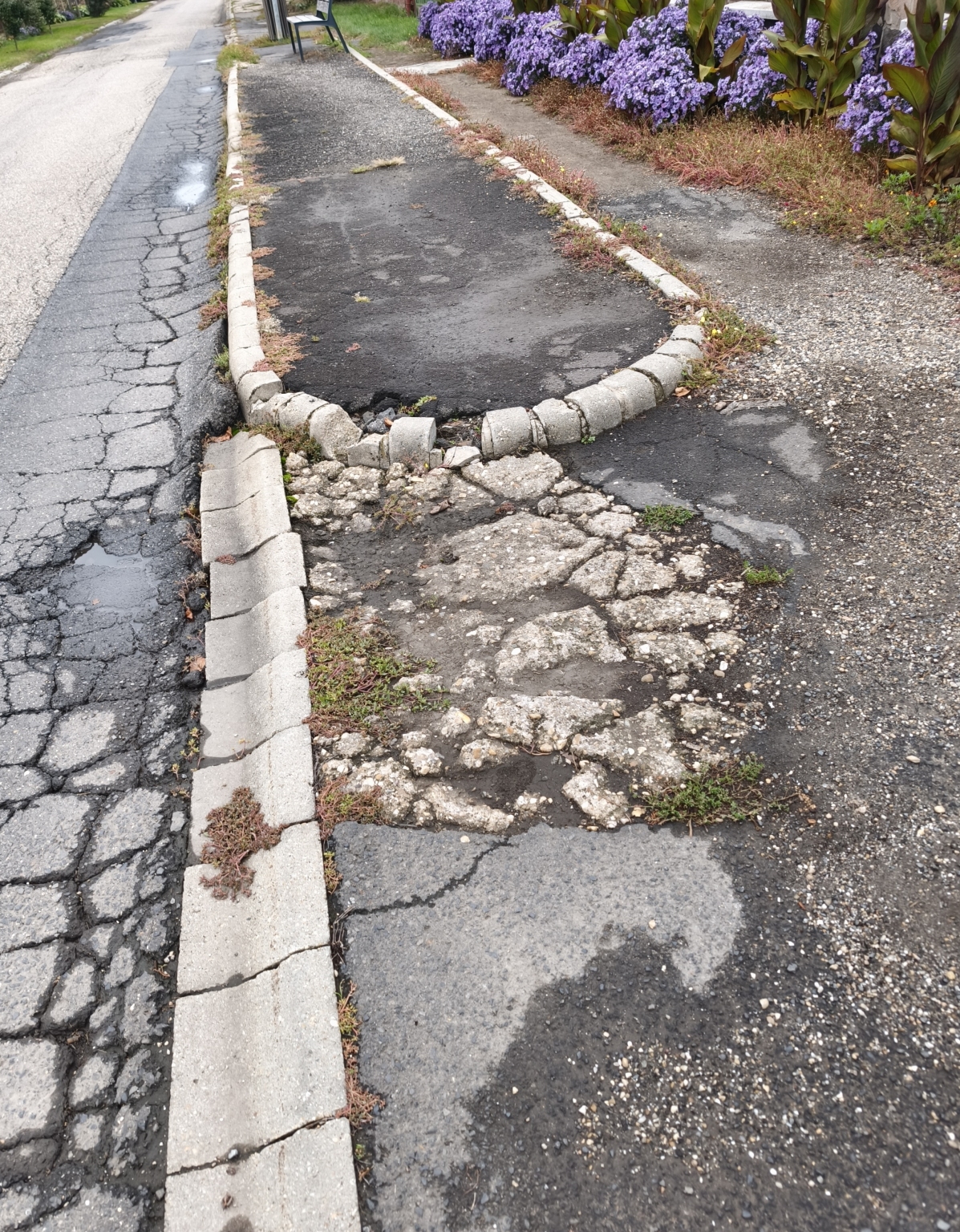 Deák Ferenc utca buszmegálló Felsőjózsán nagyon rossz állapotban van: nyomvályús út, összetört térkő, hiányzó aszfalt