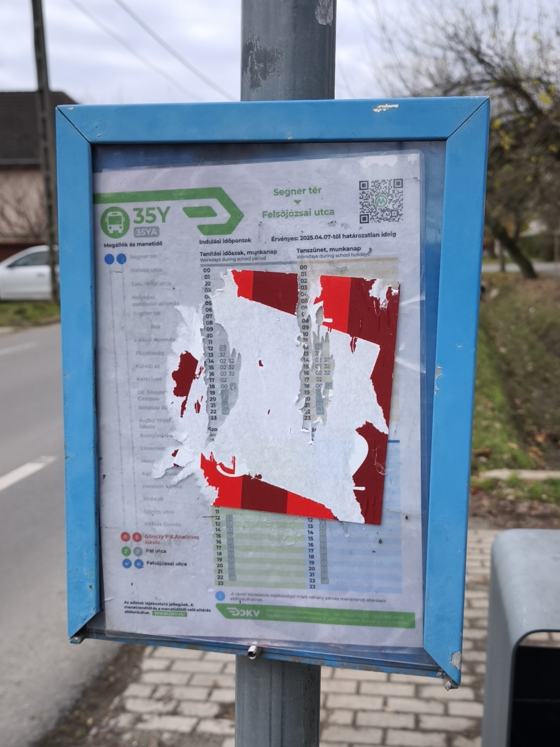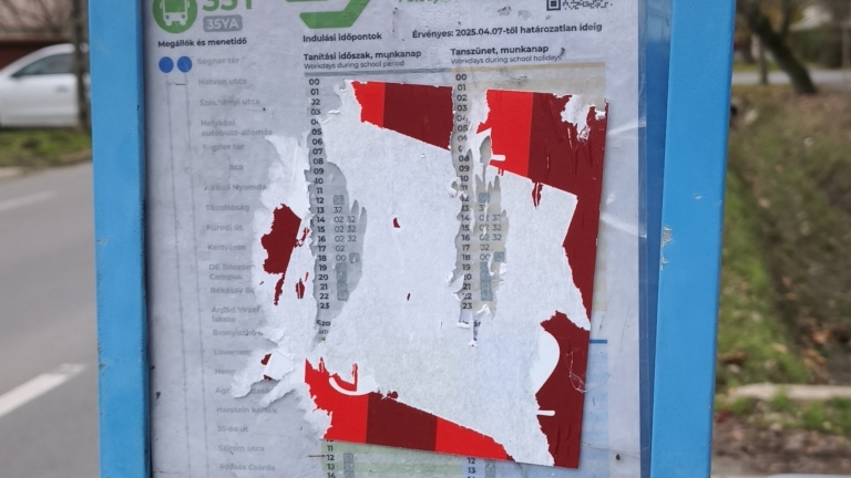 Gönczy Pál Általános Iskola megállóban egy matrica olvashatatlanná teszi a buszmenetrendet.