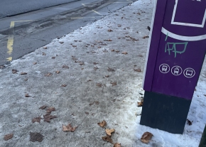 Összefirkált, koszos szemetes a Gönczy Pál Általános Iskola előtt.
