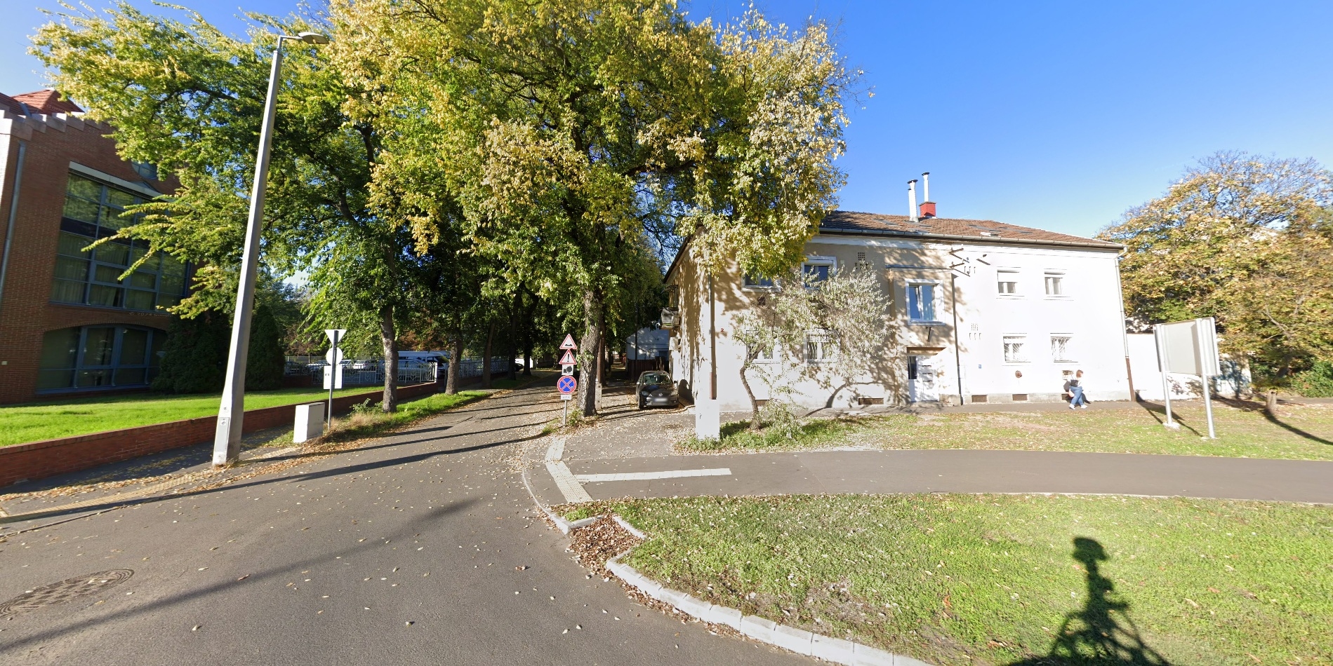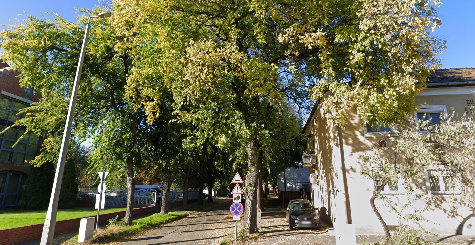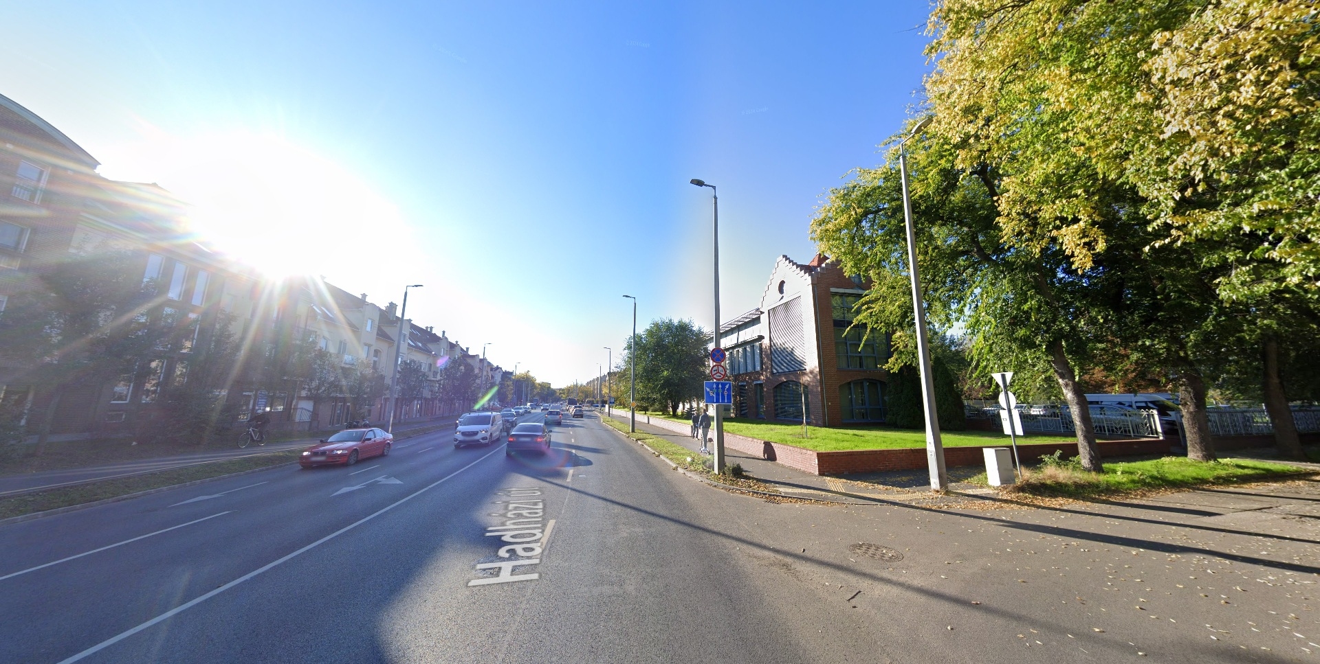 Ezzel a lámpaoszloppal kb. szemben található a Hadházi utca 2. szám alatti lakóépület.