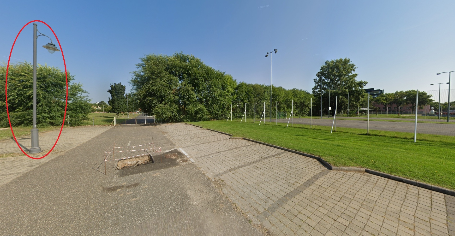 Ez a lámpaoszlop a focipálya mögötti szervízutat a Sportuszoda mögötti szervízúttól elválasztó fehér színű kerítés közelében található.