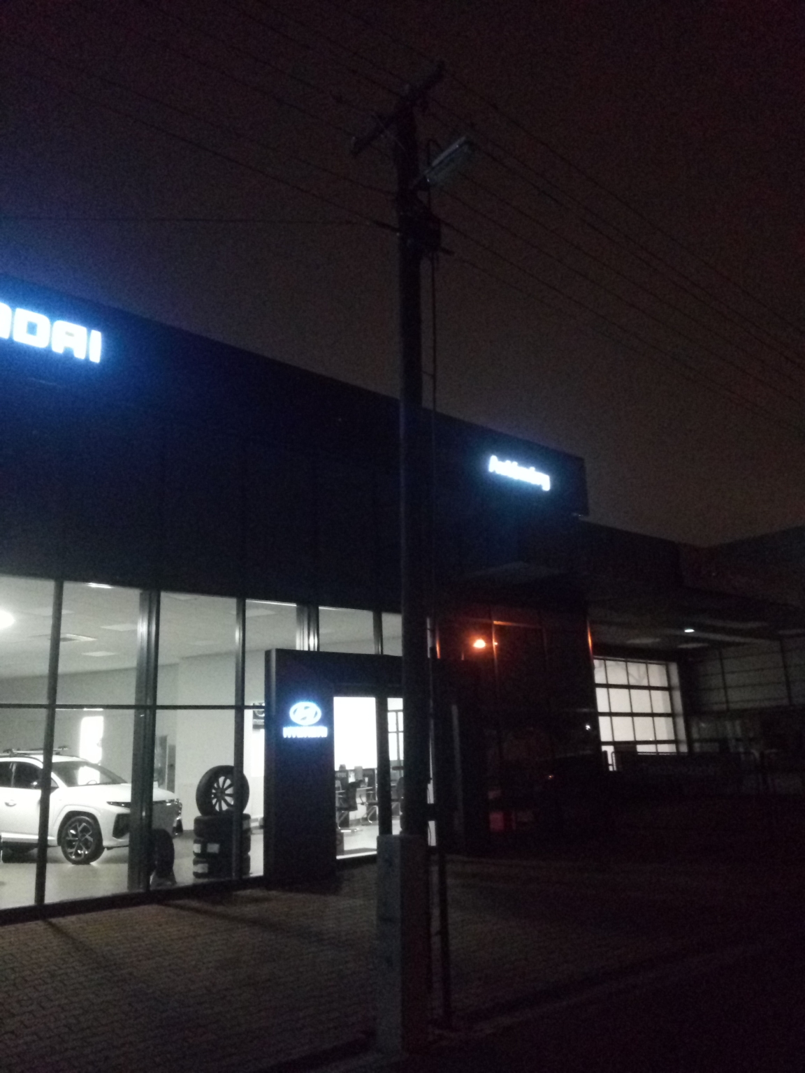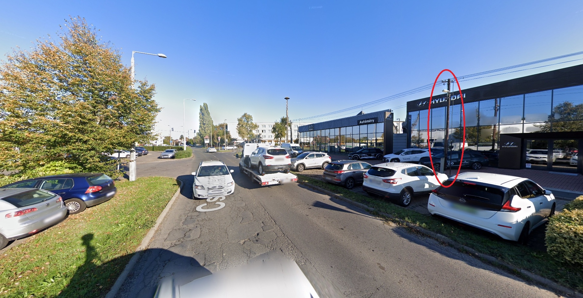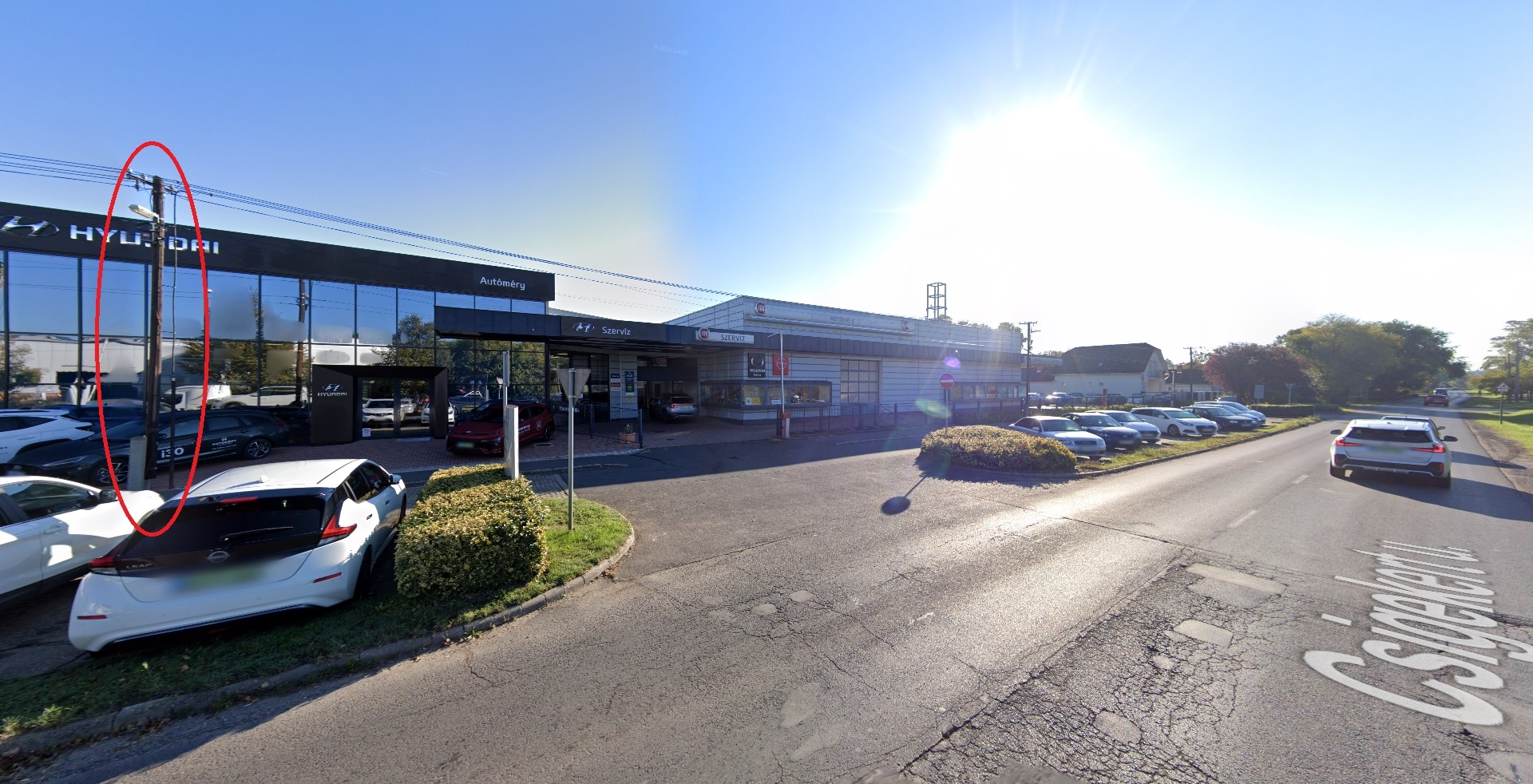 A Füredi úti Fiat Autóméry gépkocsikereskedés épületének a Csigekert utcára néző oldalán a bejárat közelében lévő lámpaoszlop nem világít.