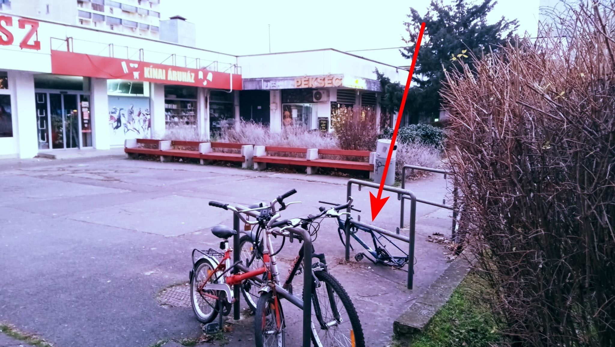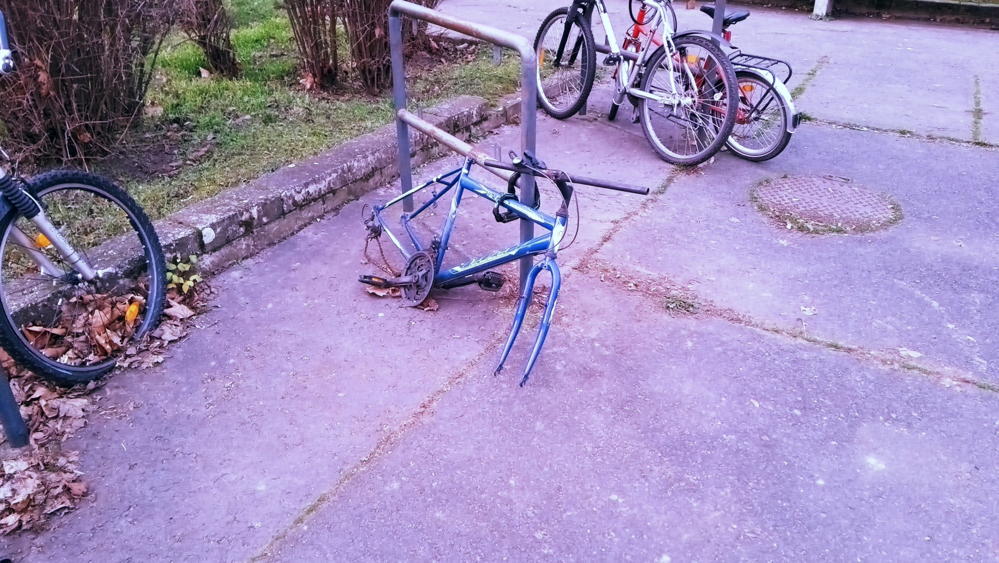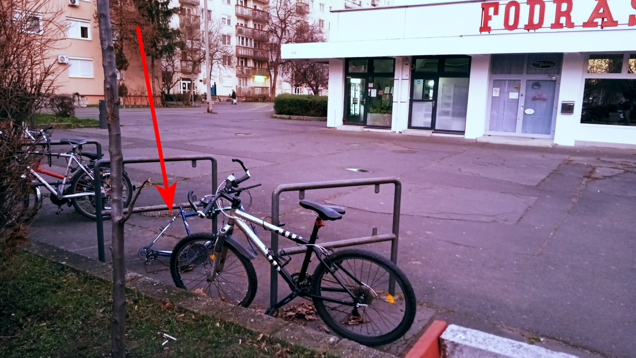 Debrecenben, a Jerikó utca 9-11. szám alatti fodrászat előtt a kerékpártároló csövekhez lakatolva található egy évek óta ottlévő, már roncs bicikli.