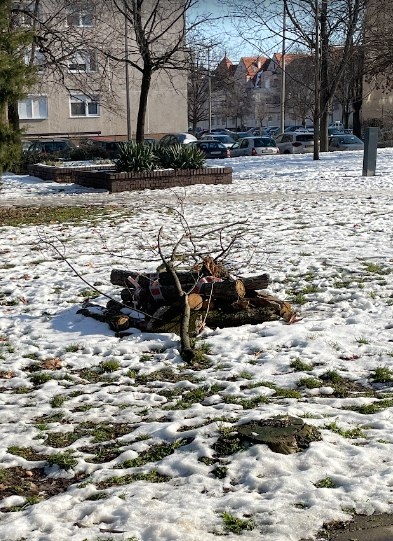 A Domokos Lajos utcán ősszel kivágtak egy fát, a mai napig ott a maradék, alatta egy gödör letakarva piros, fehér szalaggal.