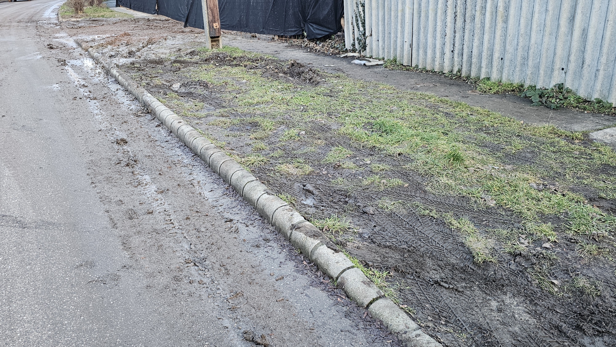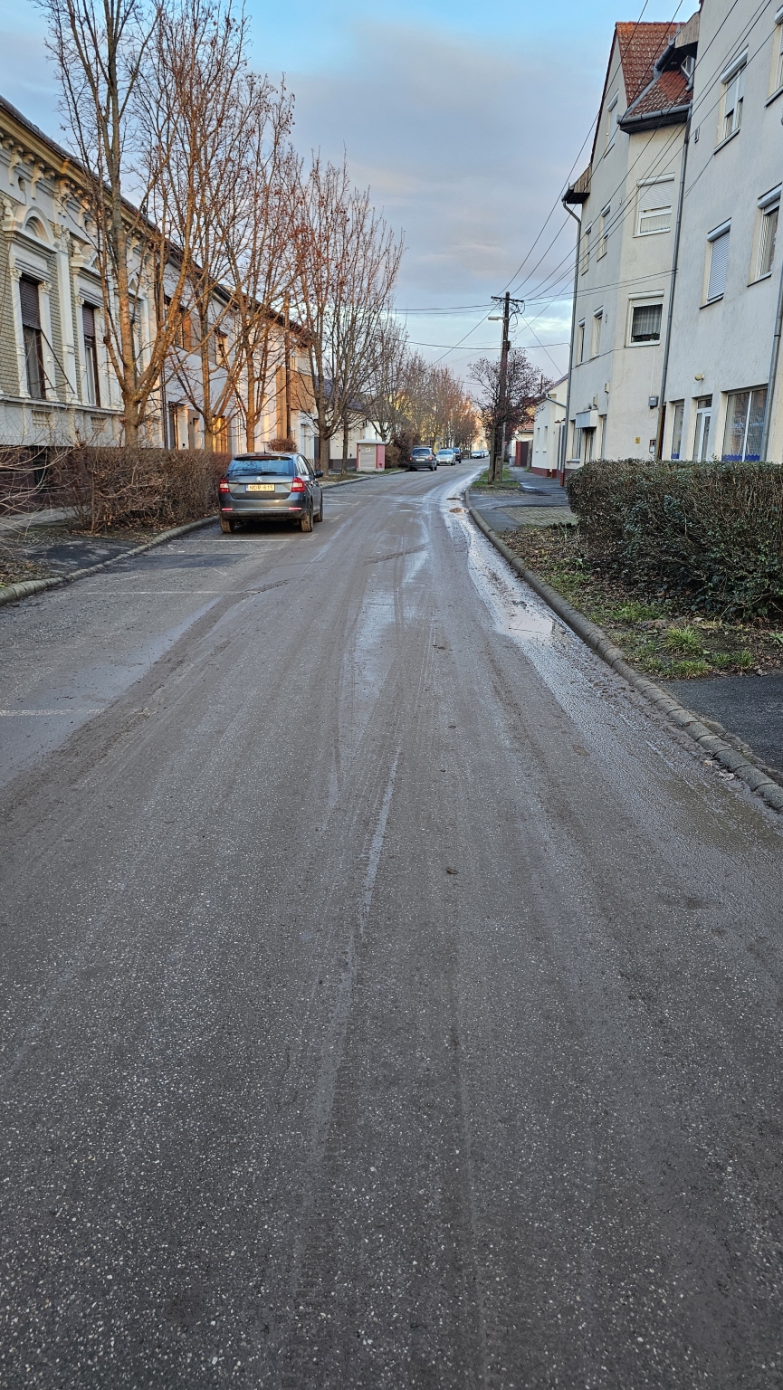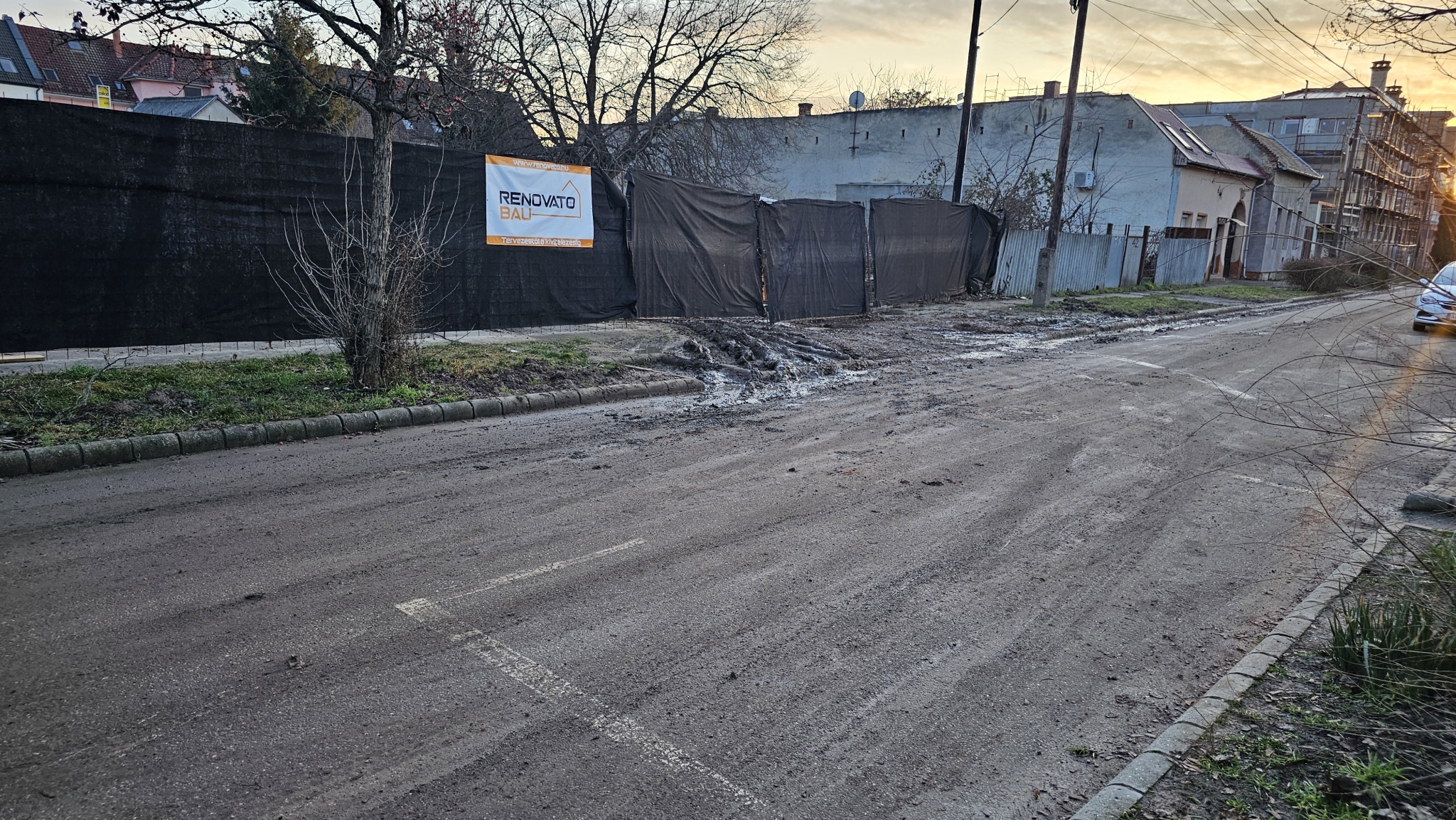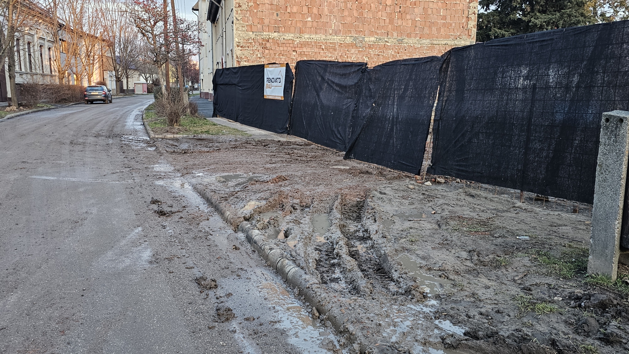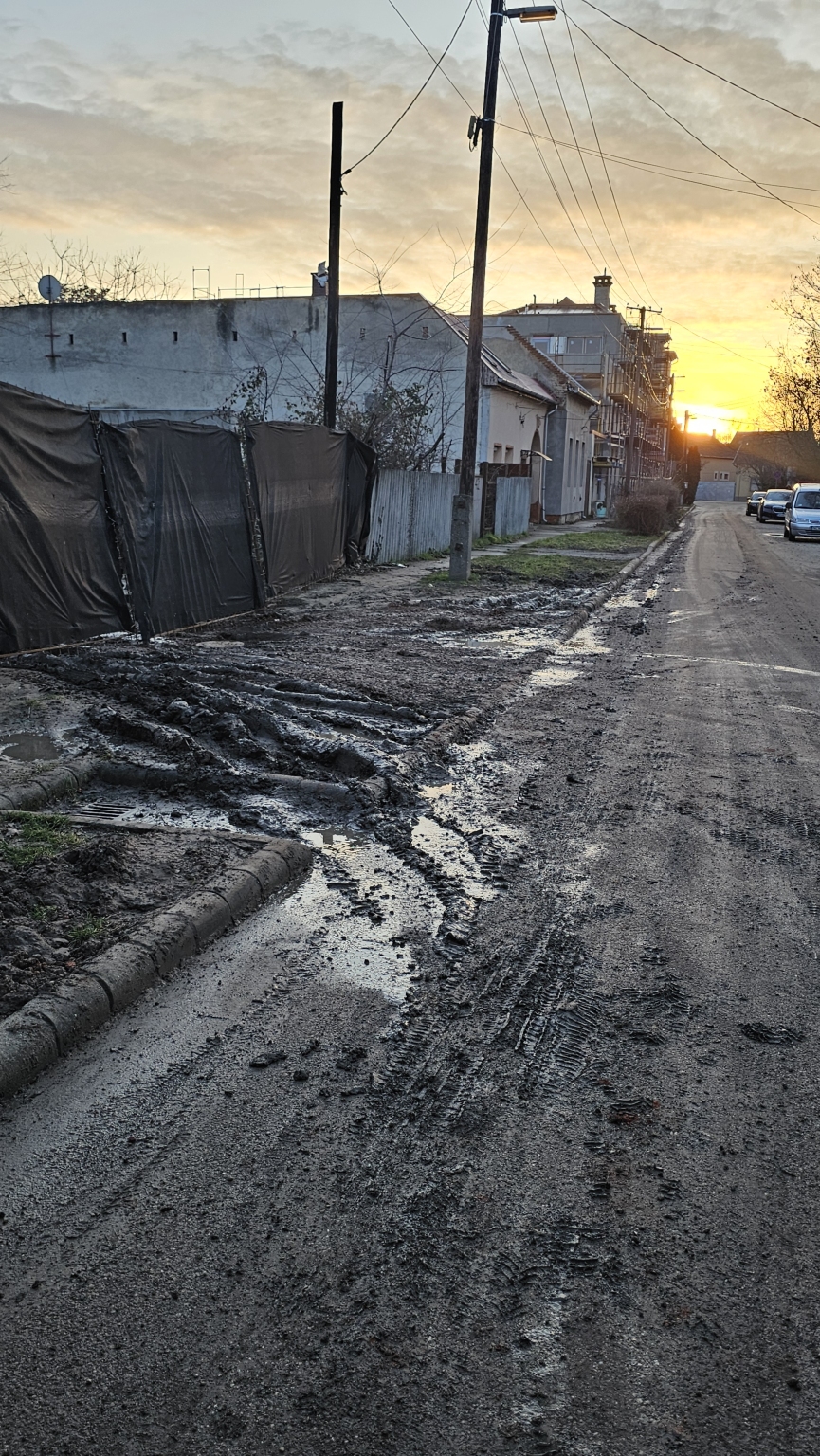 A Jókai utca 40 szám alatti építkezésről a teherautók és a munkagépek folyamatosan hordják fel a sarat az útra. Az utat egyáltalán nem takarítják.