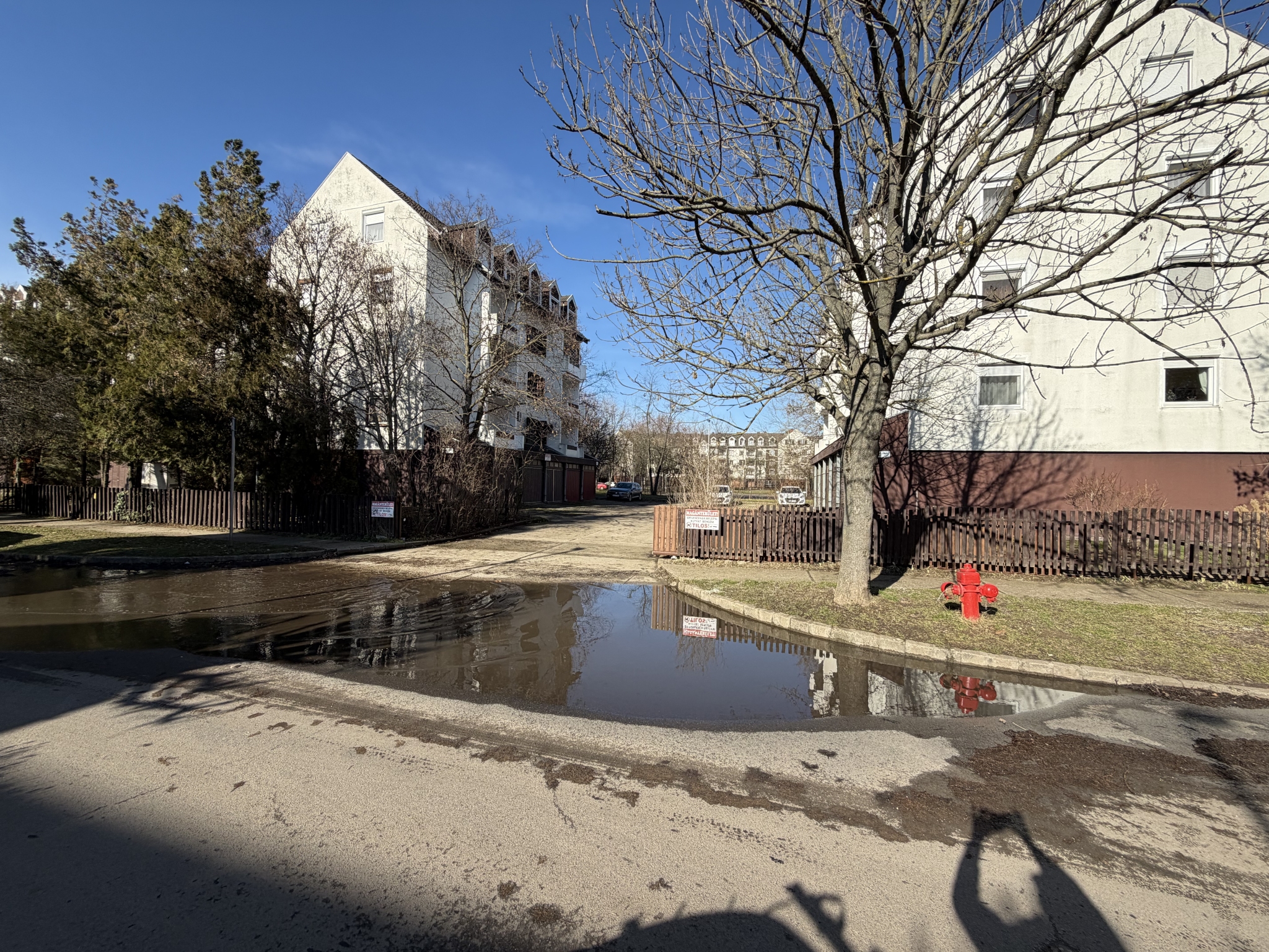 Debrecen, Sántha Kálmán utca 13. szám alatti lakos vagyok. A 11. és 13. szám közötti garázssor előtt hónapok óta áll a víz. Az esővíz elvezető csatorna valószínű eldugult, a csapadékot nem tudja elvezetni. Az utcán “sártenger” keletkezett, ezáltal a parkolás is körülményesebb.
