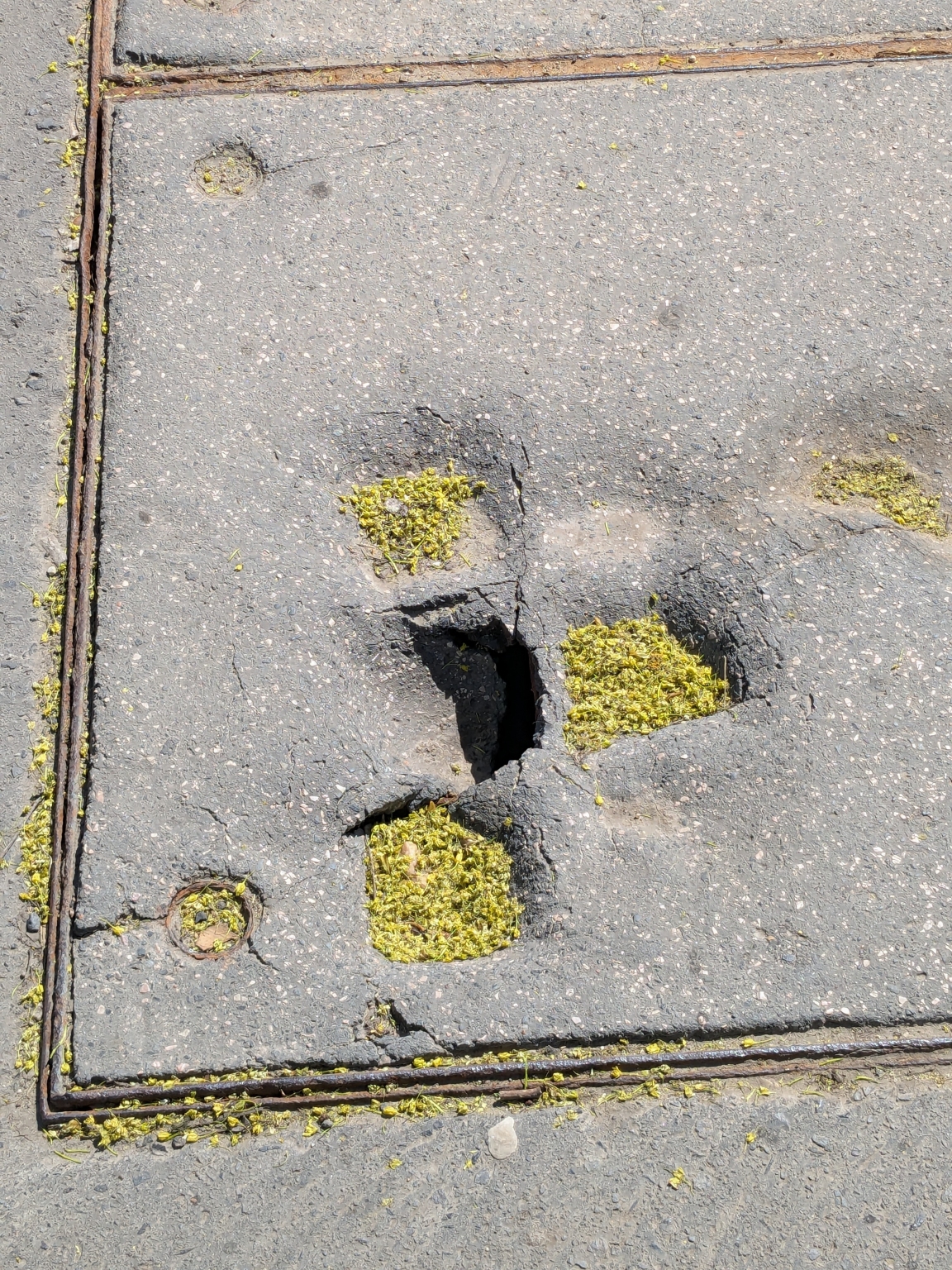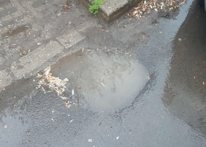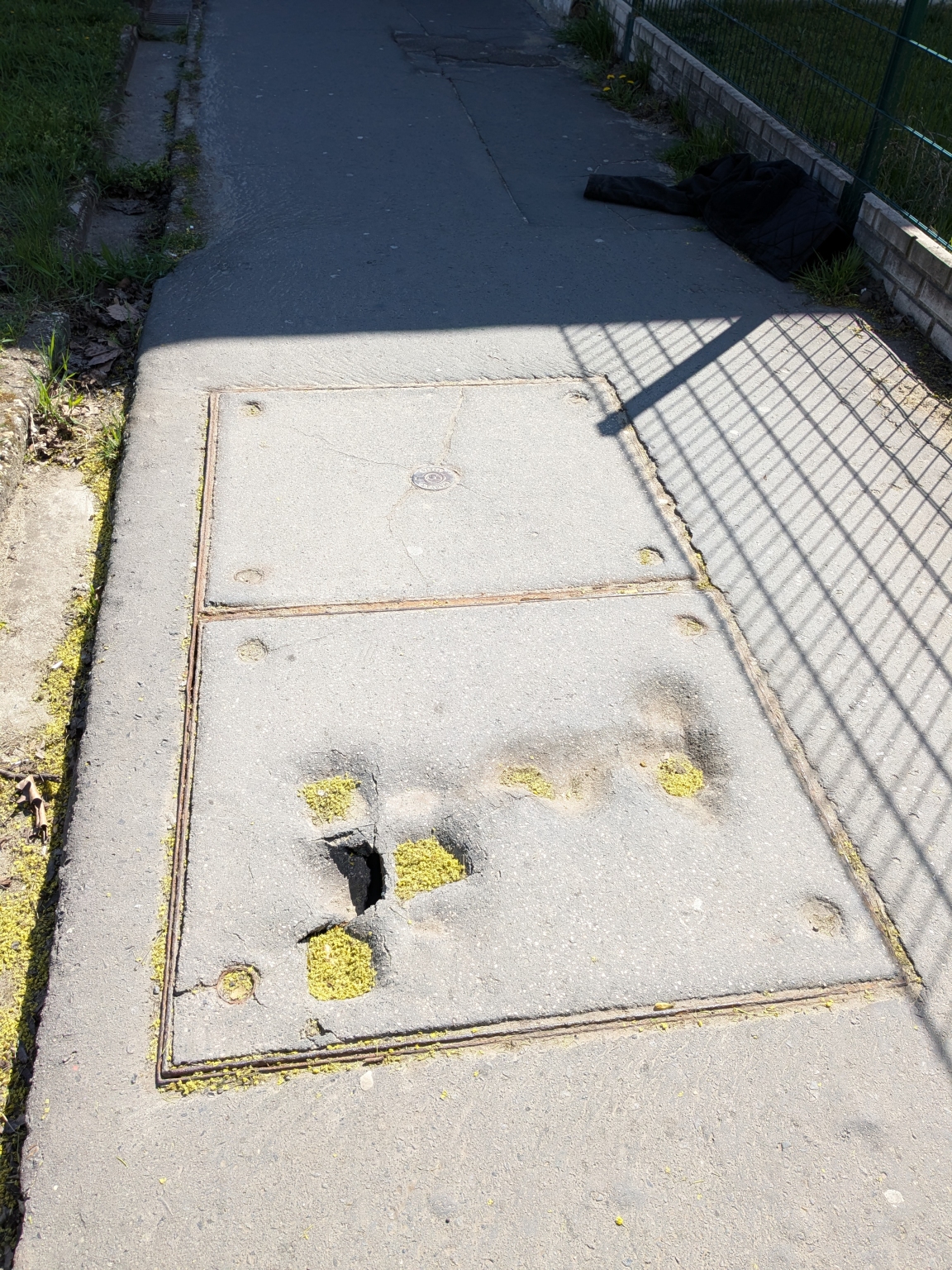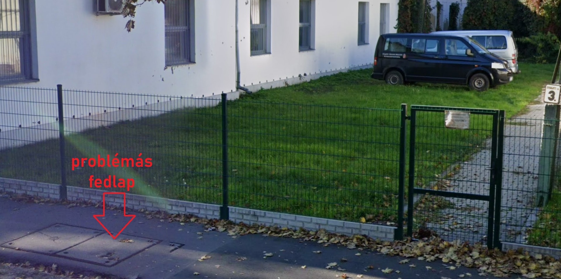 Átszakadt aknafedél a járda vonalában a Nyugati utca 3. szám előtt.