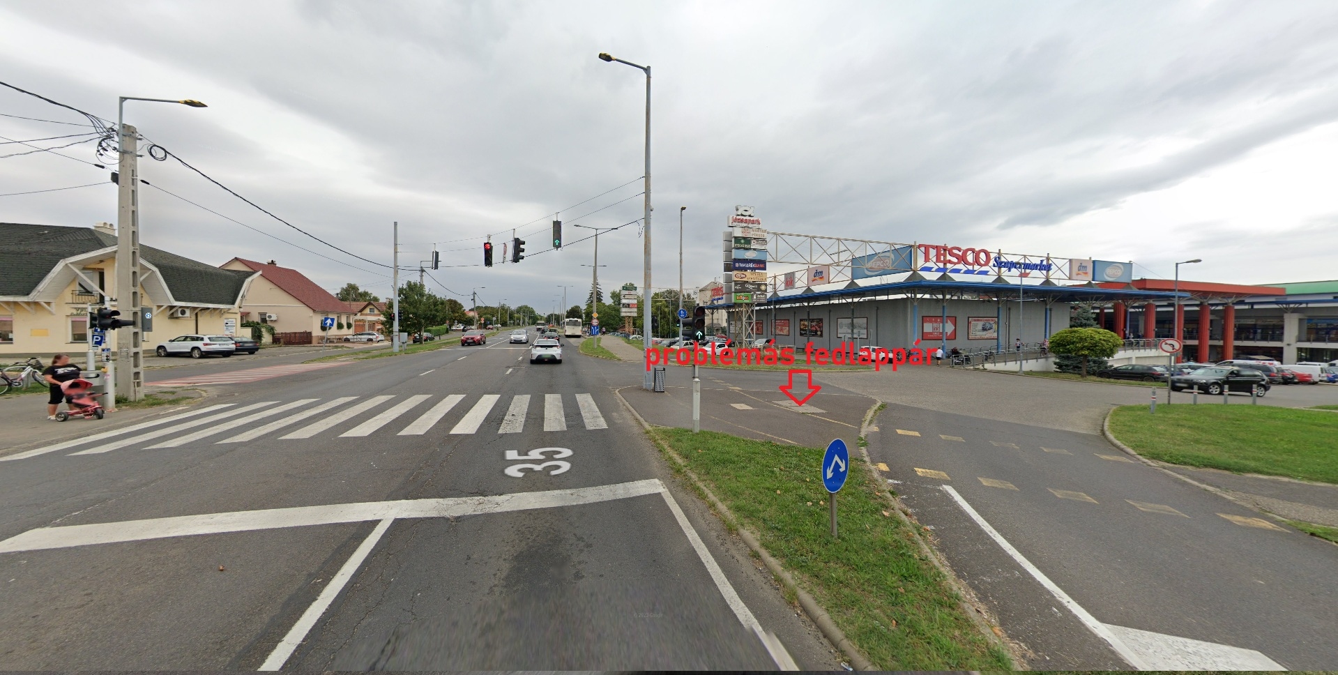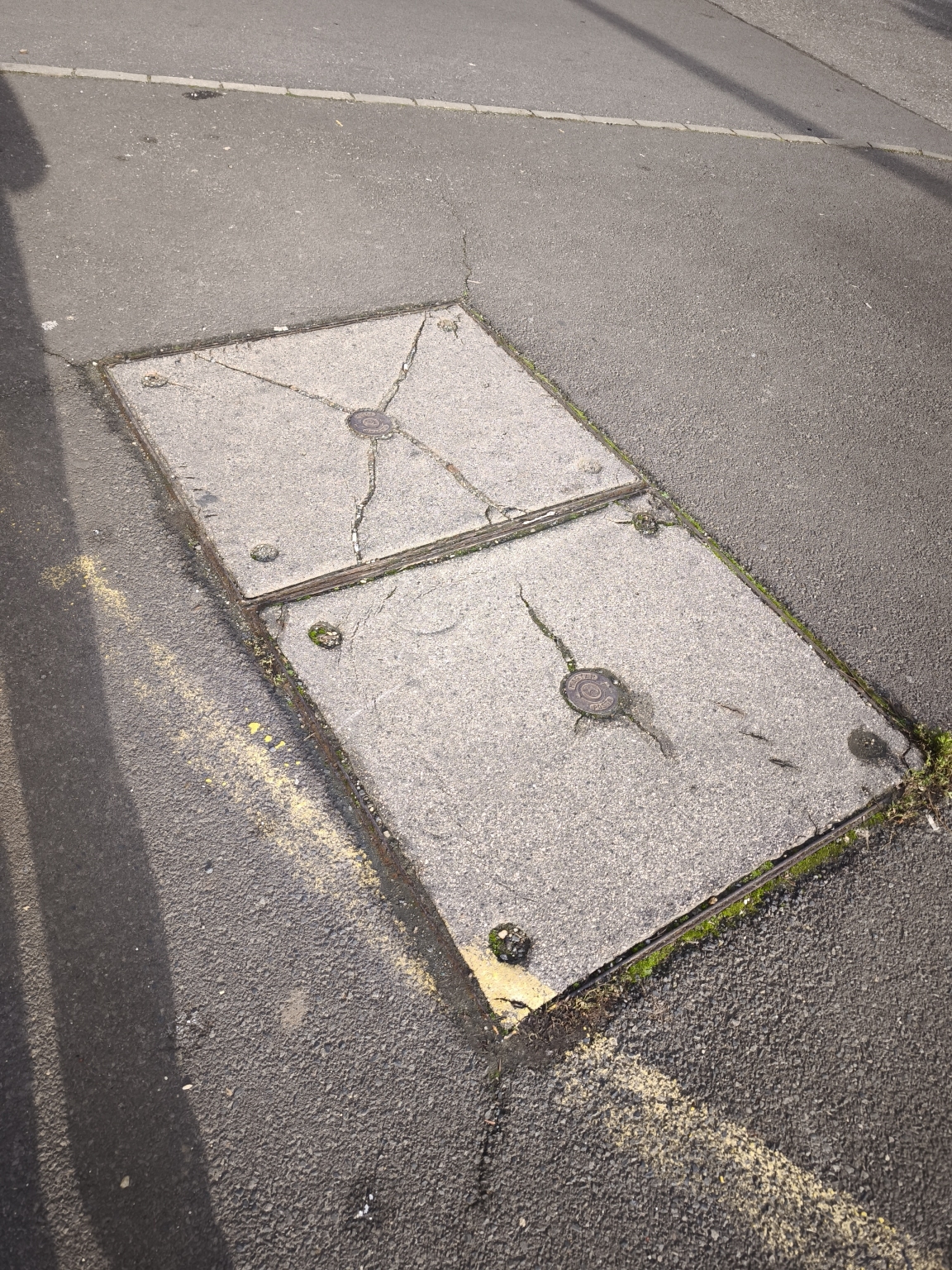 Magyar Posta feliratú, szétrepedt közmű fedlappár a Józsapark előtti kereszteződésben található járdaszigeten.