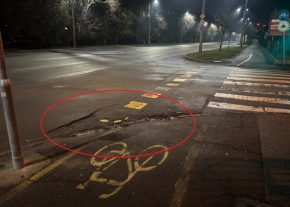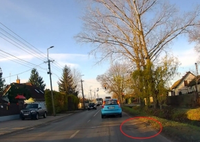 Hatalmas kátyú, esőben, sötétben nem látszik, balesetveszélyes. Keskeny az út is ha két autó megy egymás mellett akkor valaki biztos bele kell menjen.