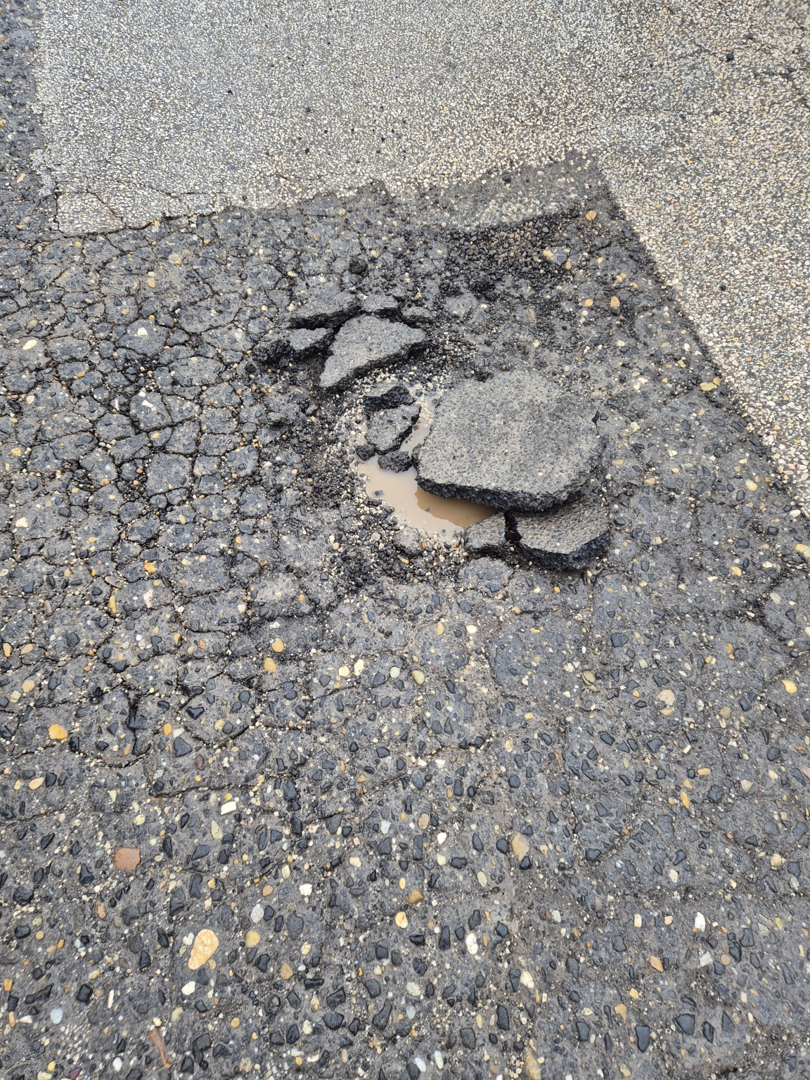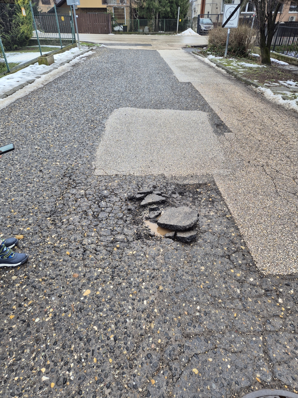 Többször foltozott kátyú szétfagyott az út kellős közepén.