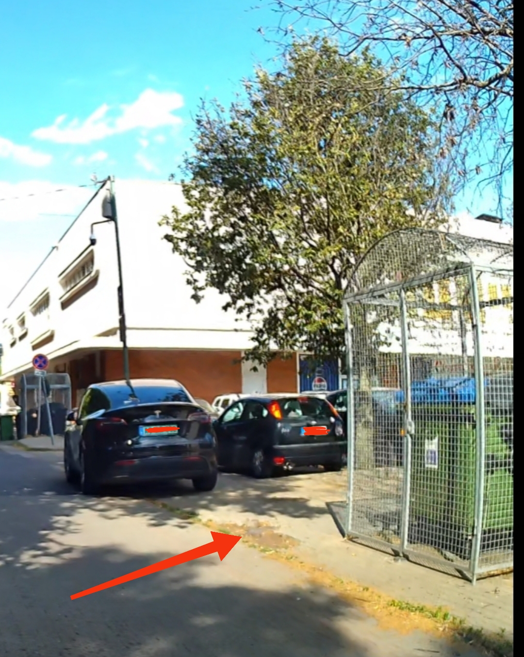 Dunaújvárosban, a Dózsa György út 28-30. (Butiksor, OTP Bank sarok) előtt lévő zárt szeméttároló elején, nagy területen hiányzik a térkő burkolat!