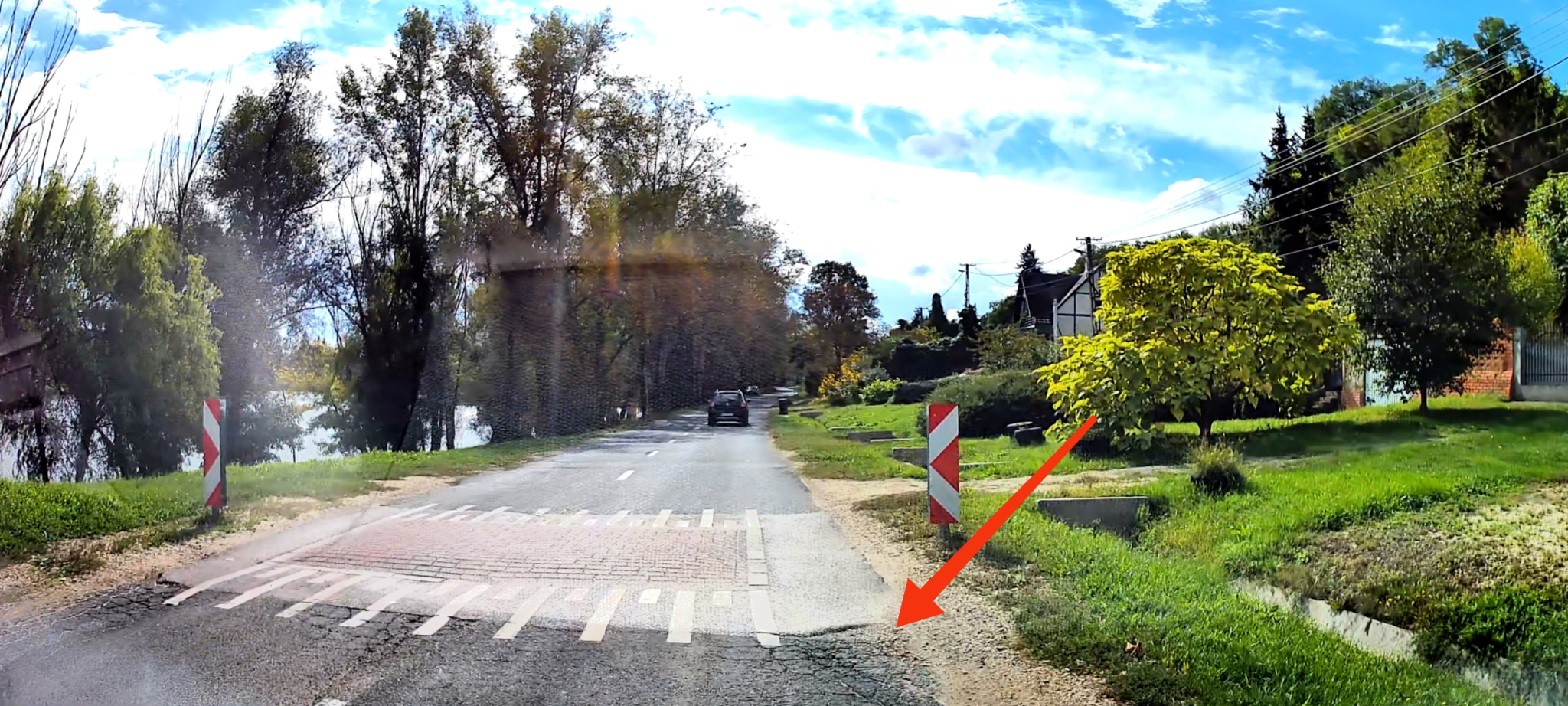 Dunaújváros, Üdülősori úton, a szabadstrand dunai befolyó részétől - a Barsi Dénes utcáig terjedő szakaszon, a forgalom lassító "bukkanóknál", 2db mély kátyú található!