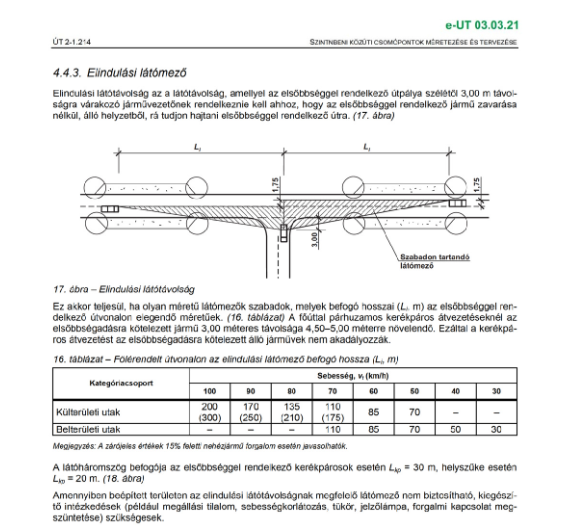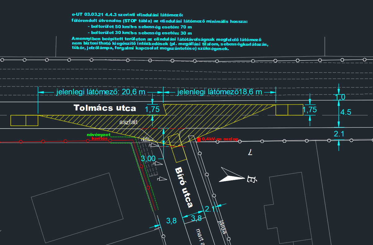 „A szabvány (e-ut 03.03.21 4.4.3) szerinti elindulási látómező belterületen 50km/h-s sebesség esetén 70m, 30km/h sebesség esetén 30m, de a tárgyi kereszteződésben csak 18,6m a látómező!!! Így az nem megfelelő, BALESETVESZÉLYES!!!