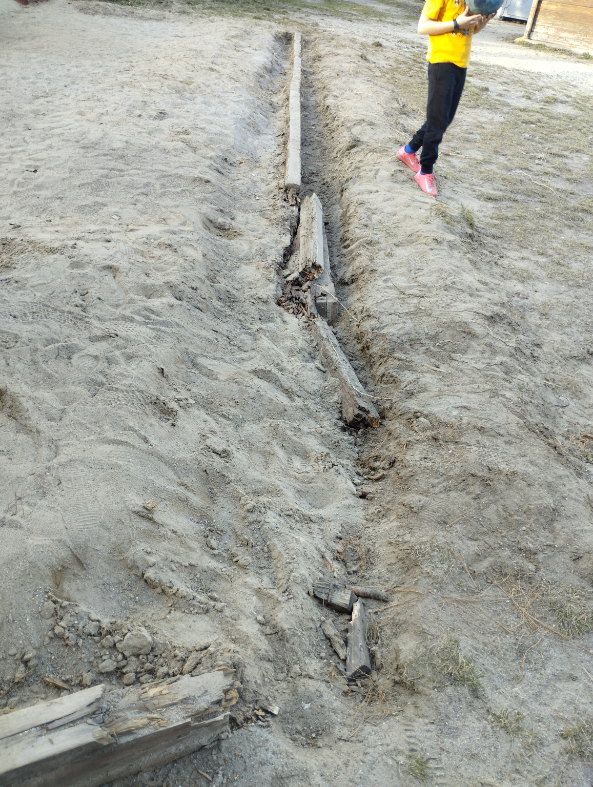 Érd, Fügefa utcai játszótéren a csúszda előtti fa gerenda elkorhadt, balesetveszélyes.