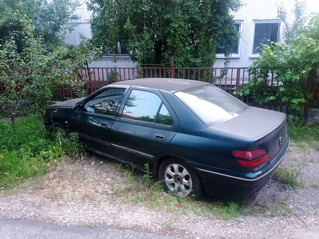 Az Előadó utcában van egy nyitott ablakú lejárt műszakis Peugeot szétszedett belsővel.