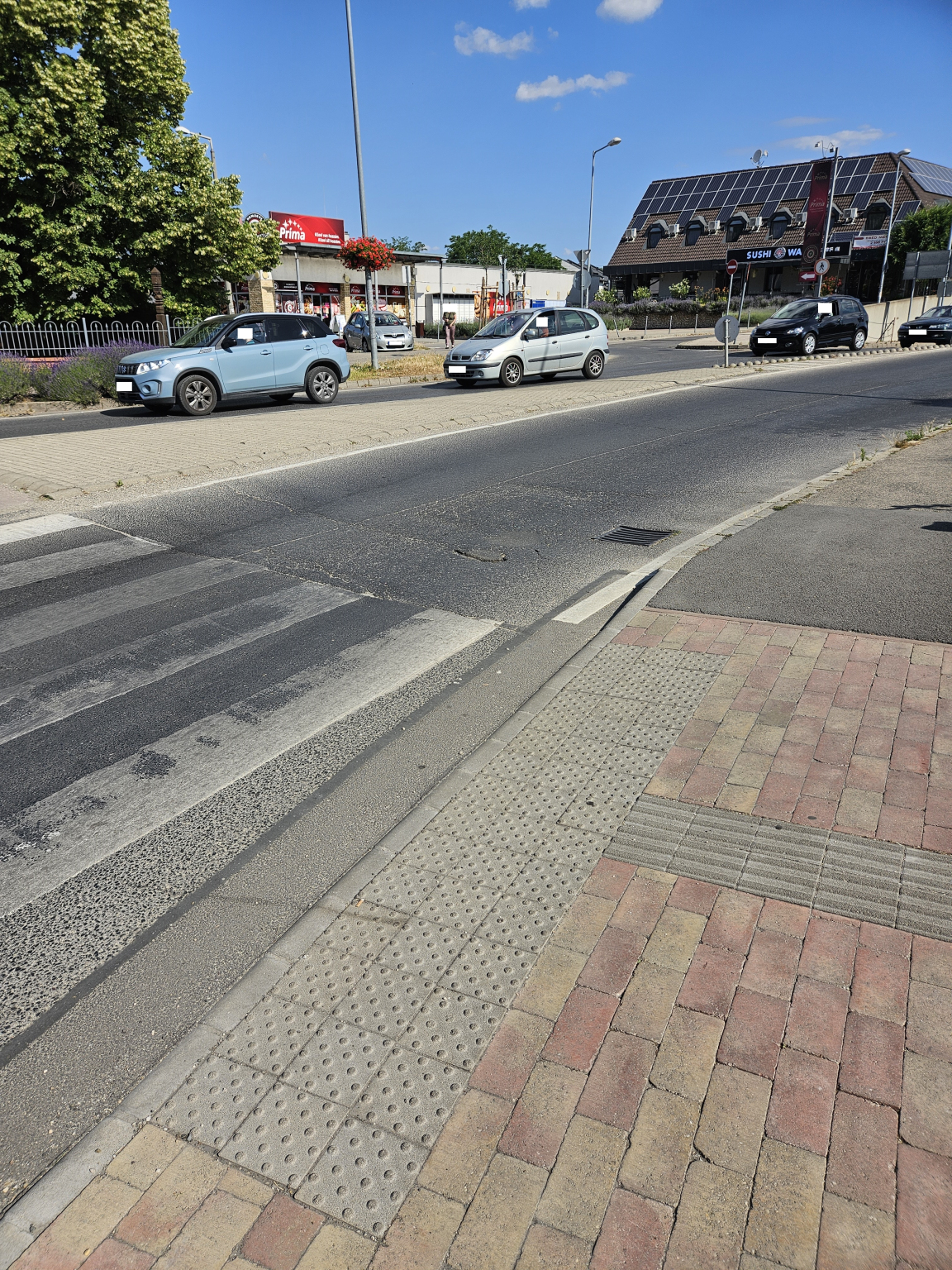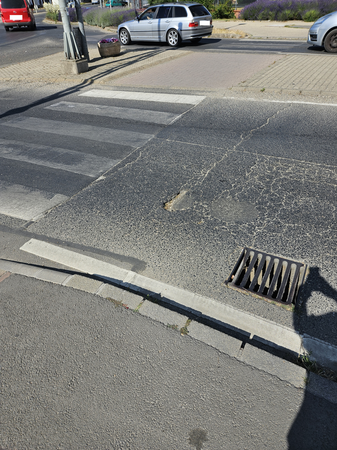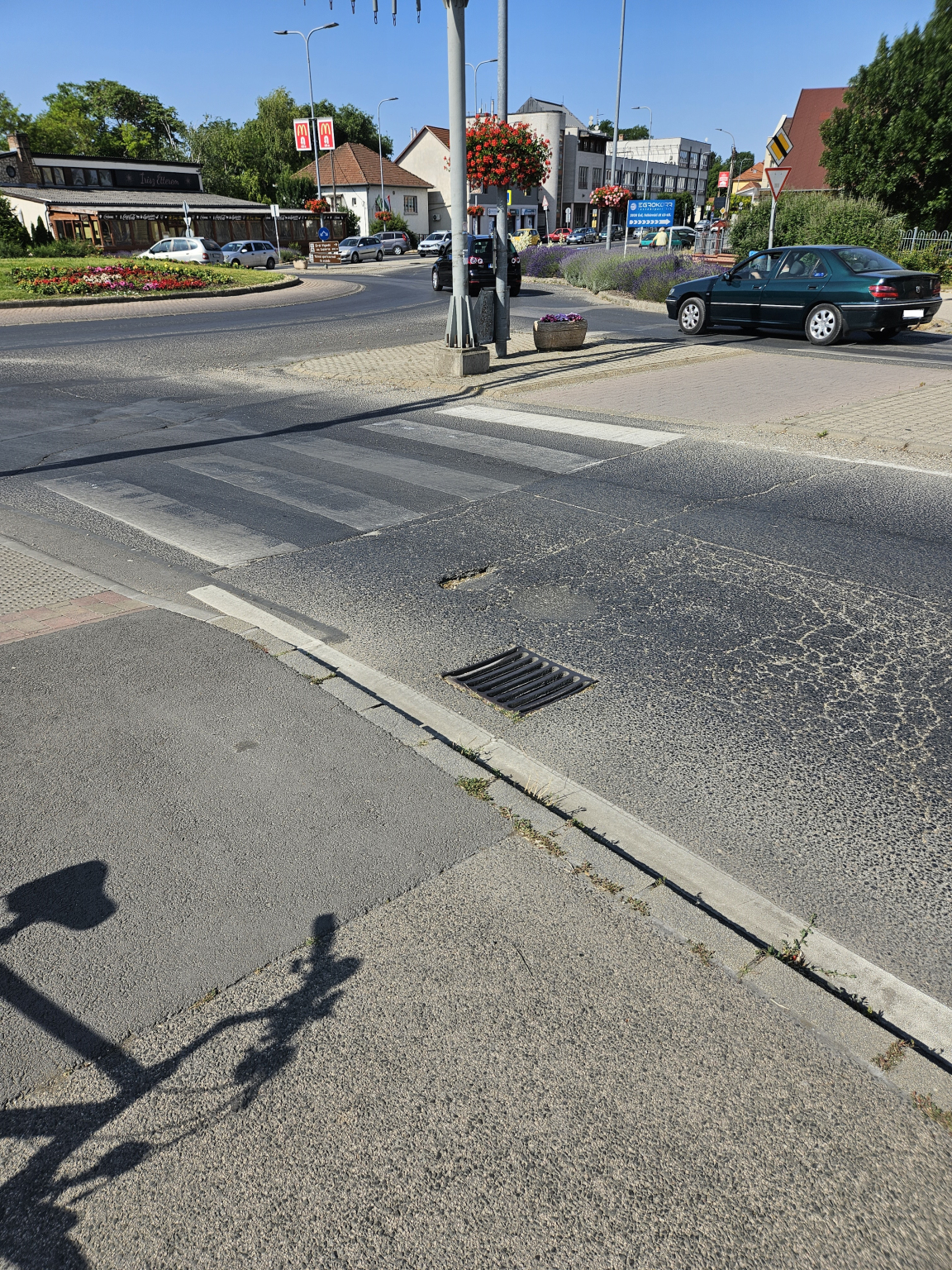 A központi körforgalom aluljáró felé vezető ágánál egy kátyú van.