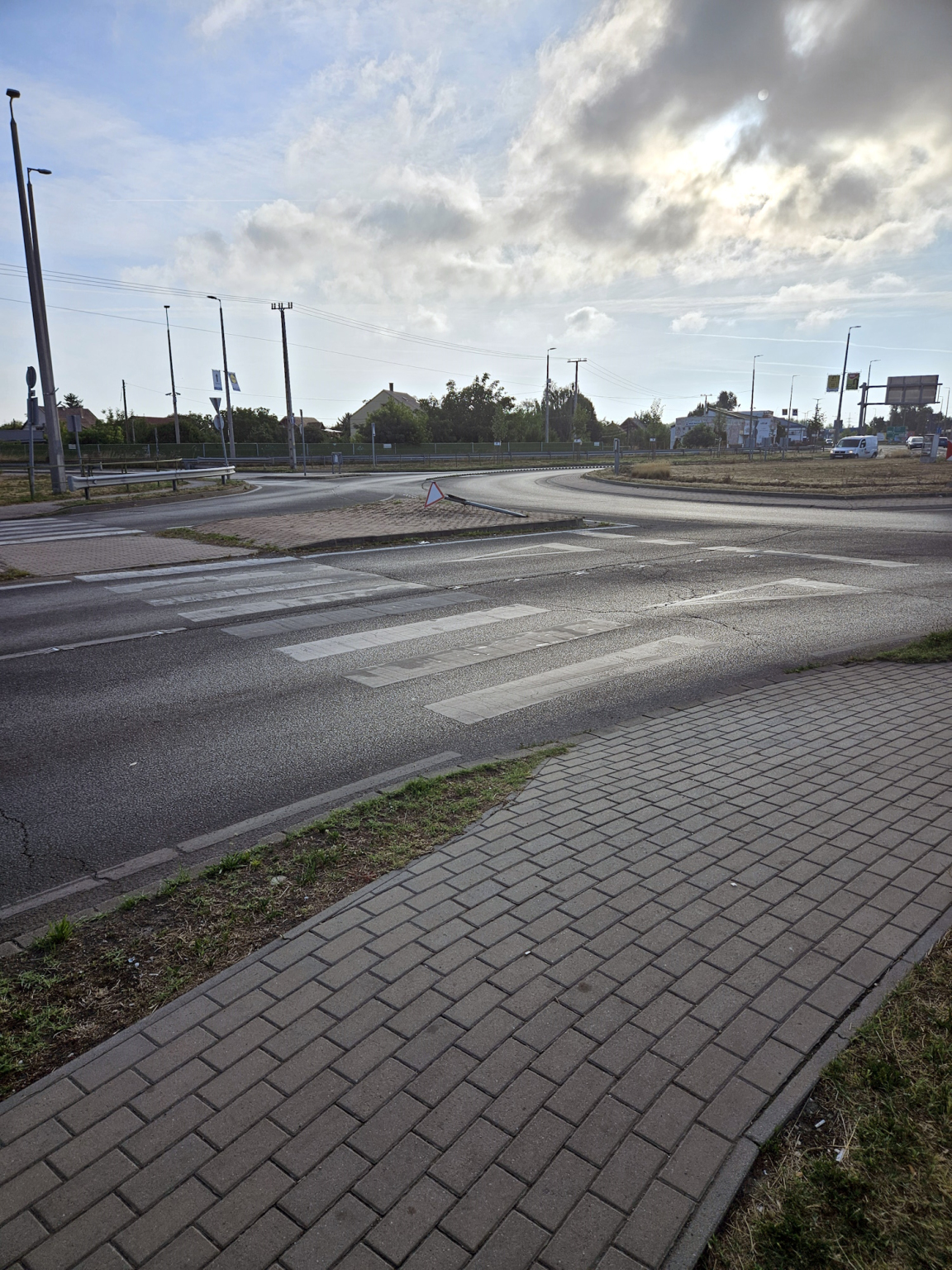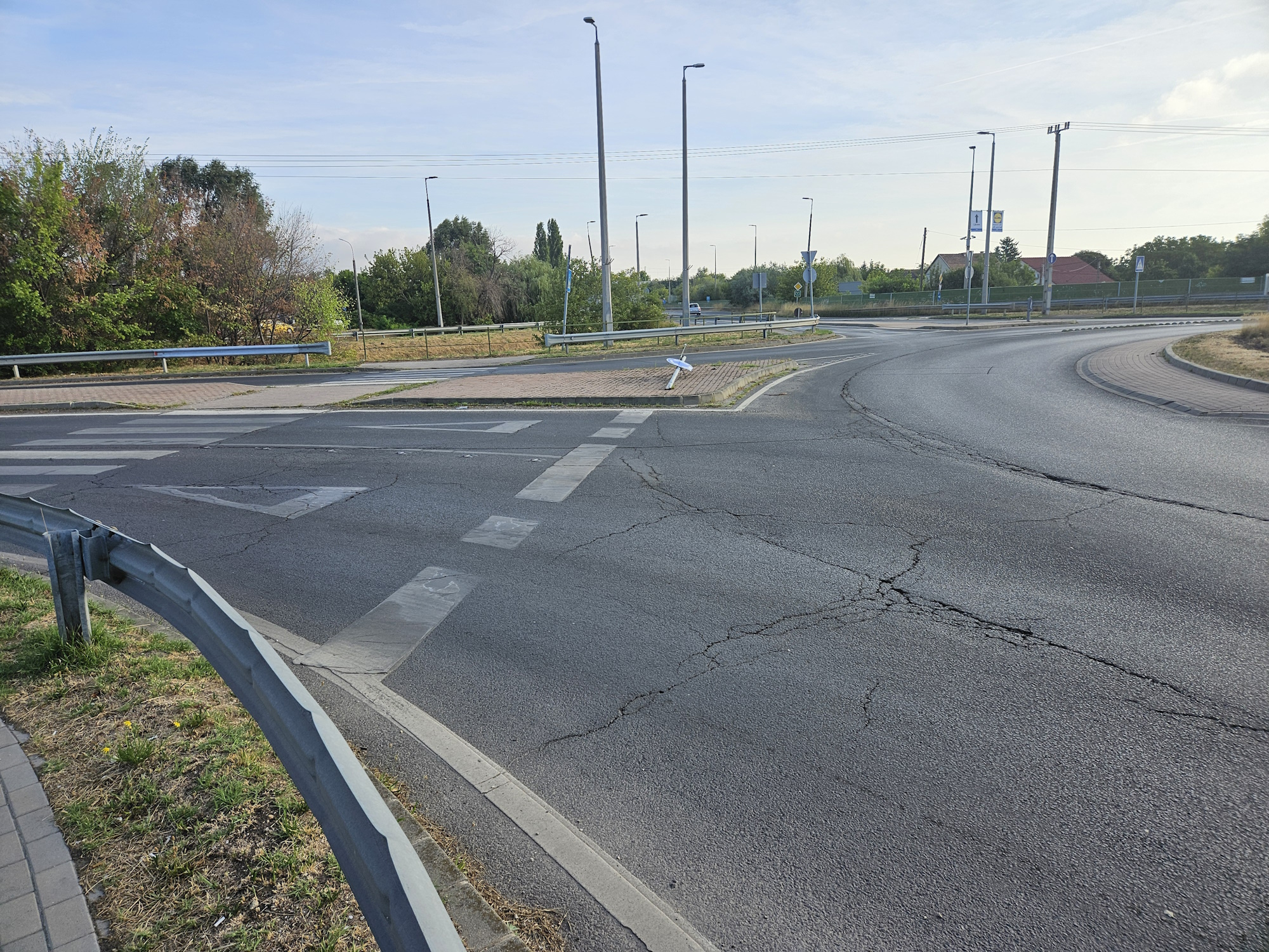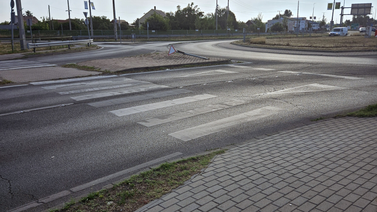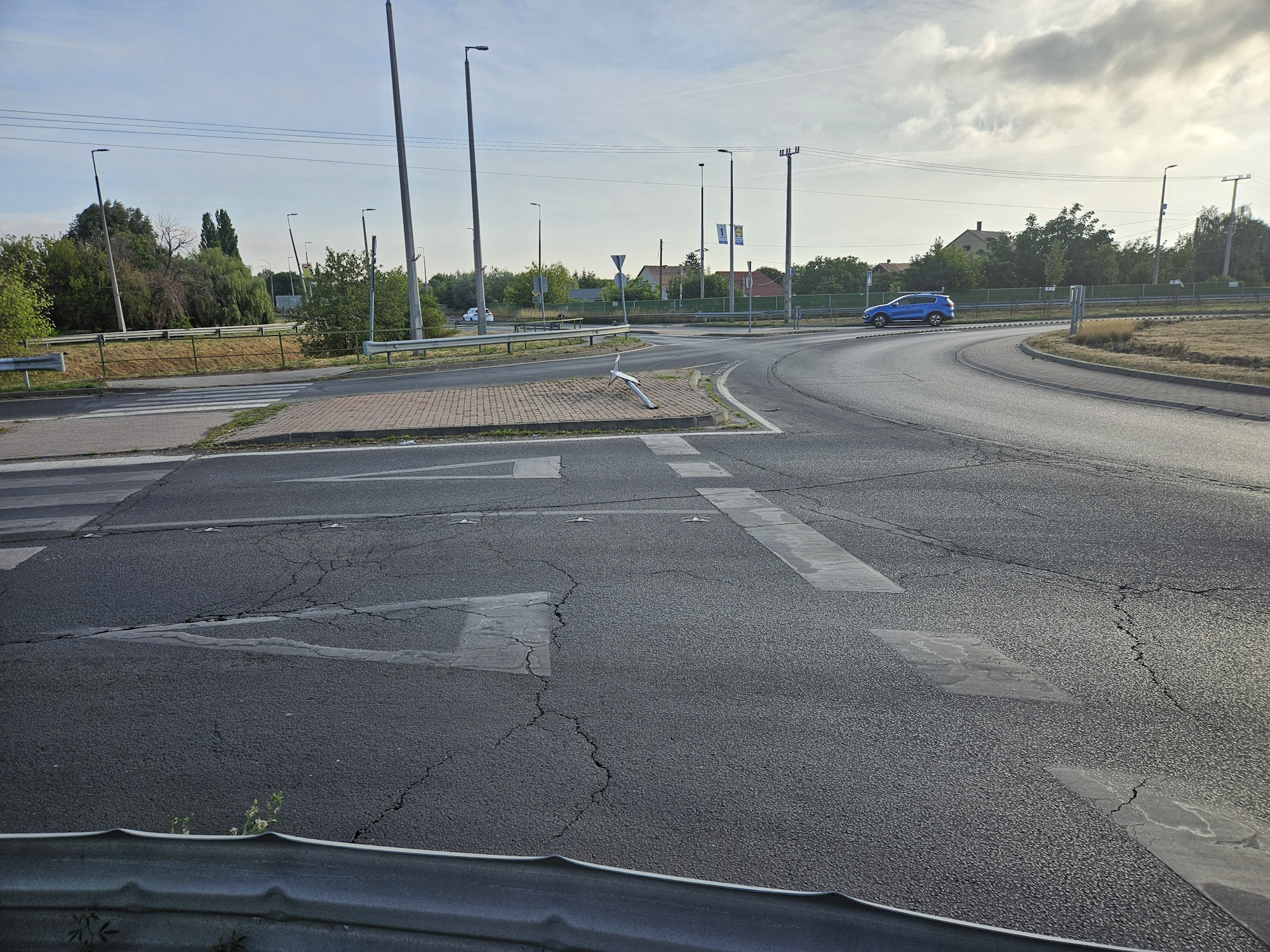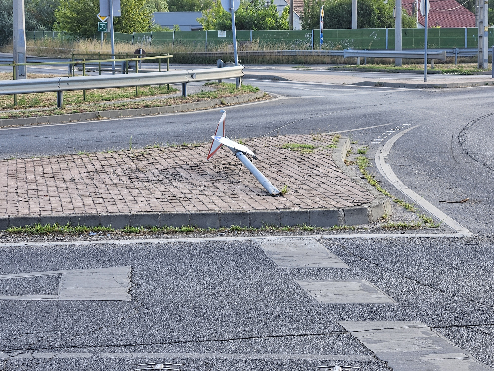 A Tesco-s körforgalomban kidőlt a Budai út felőli részen egy tábla.