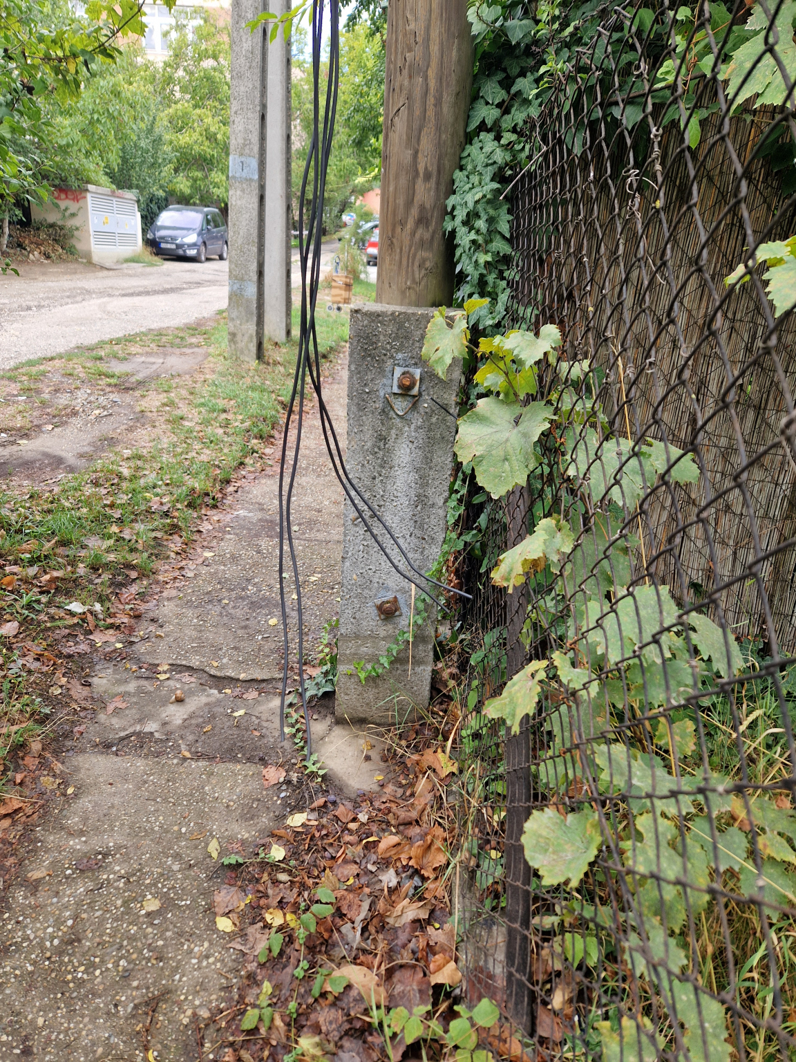 Ágota utca 6 szám előtt a villanyoszlopról kábel lóg a járdára.