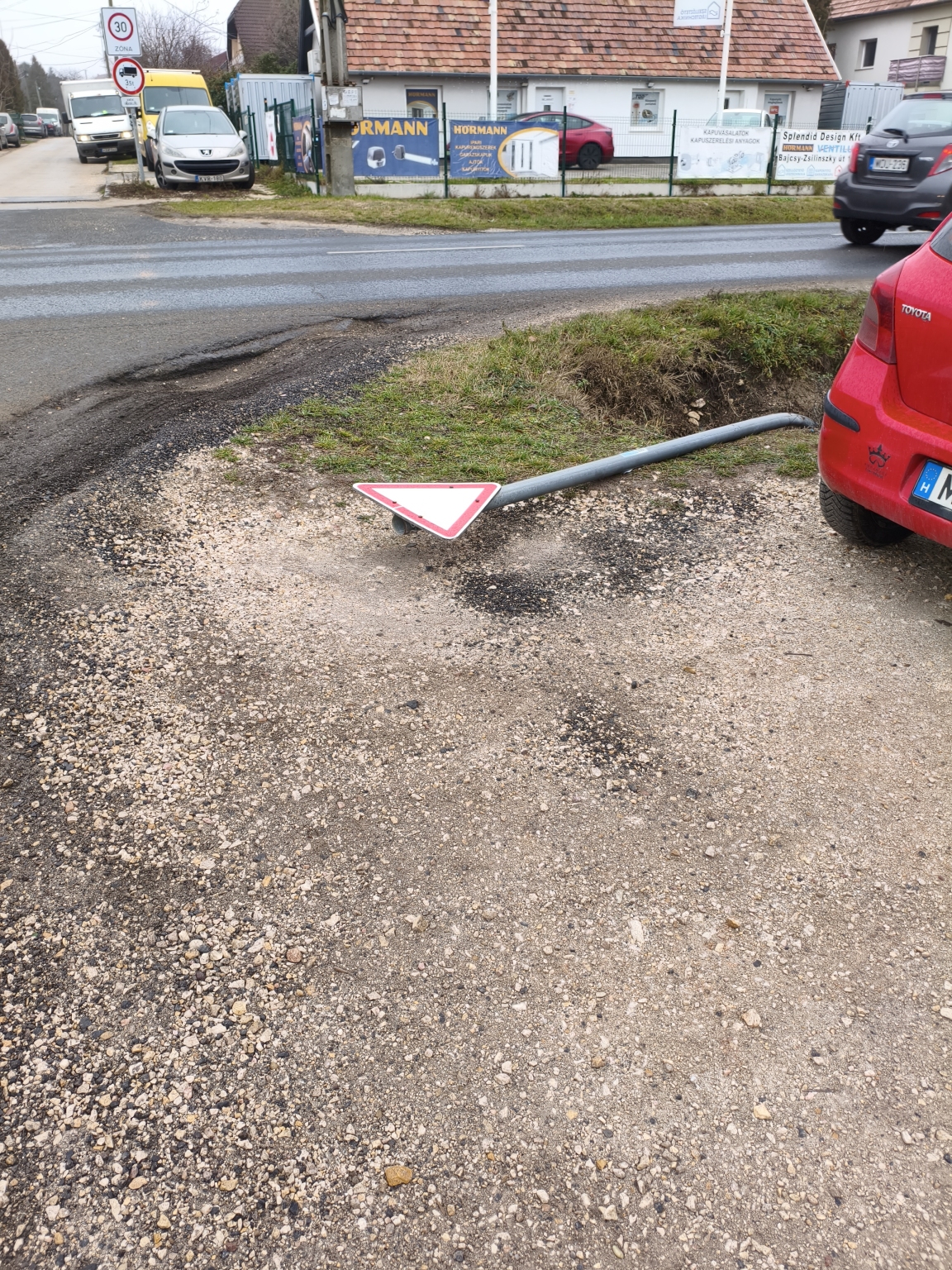 Kidőlt jelzőtábla Érden a Bajcsy- Somogyvári sarkán.