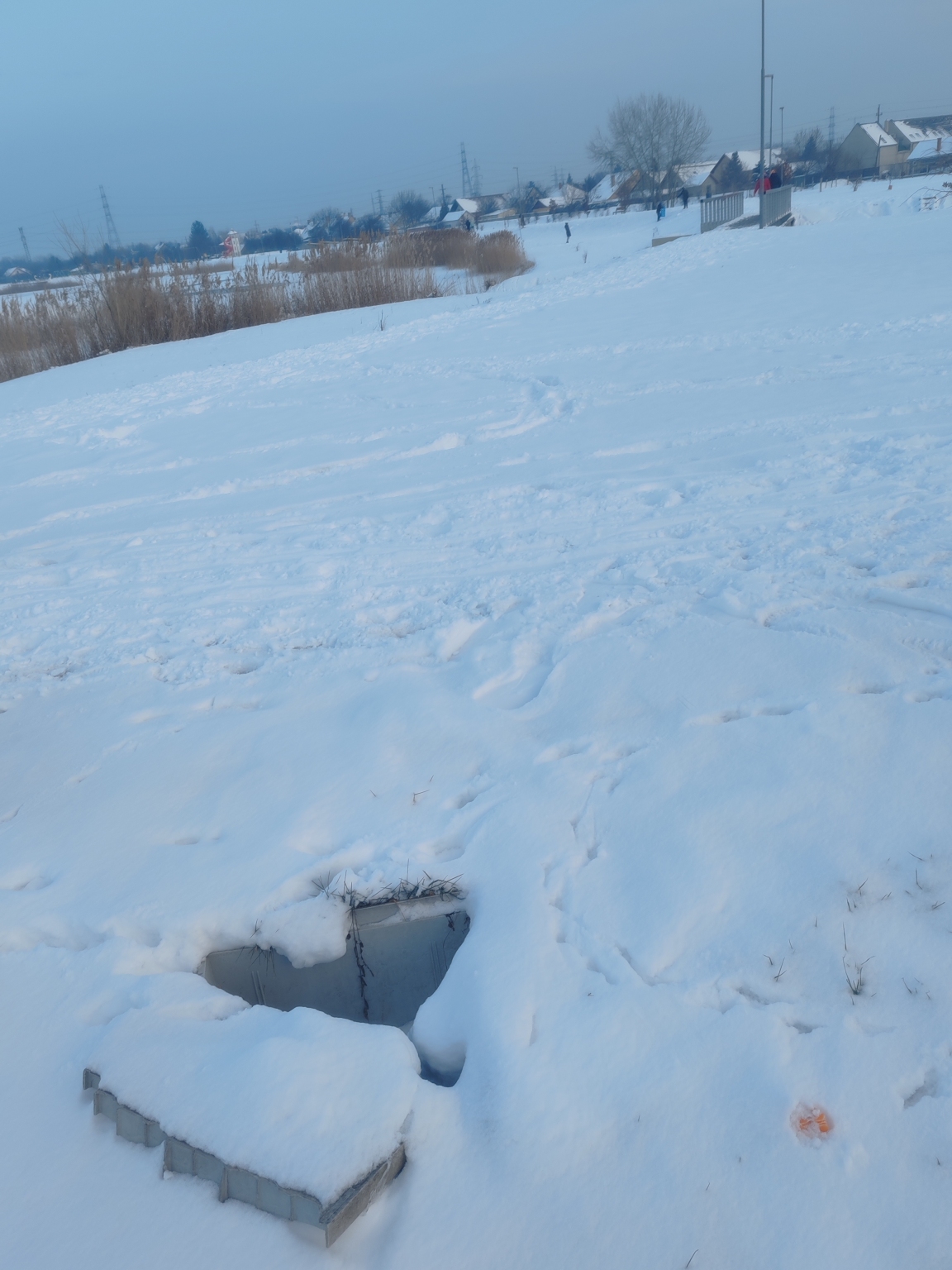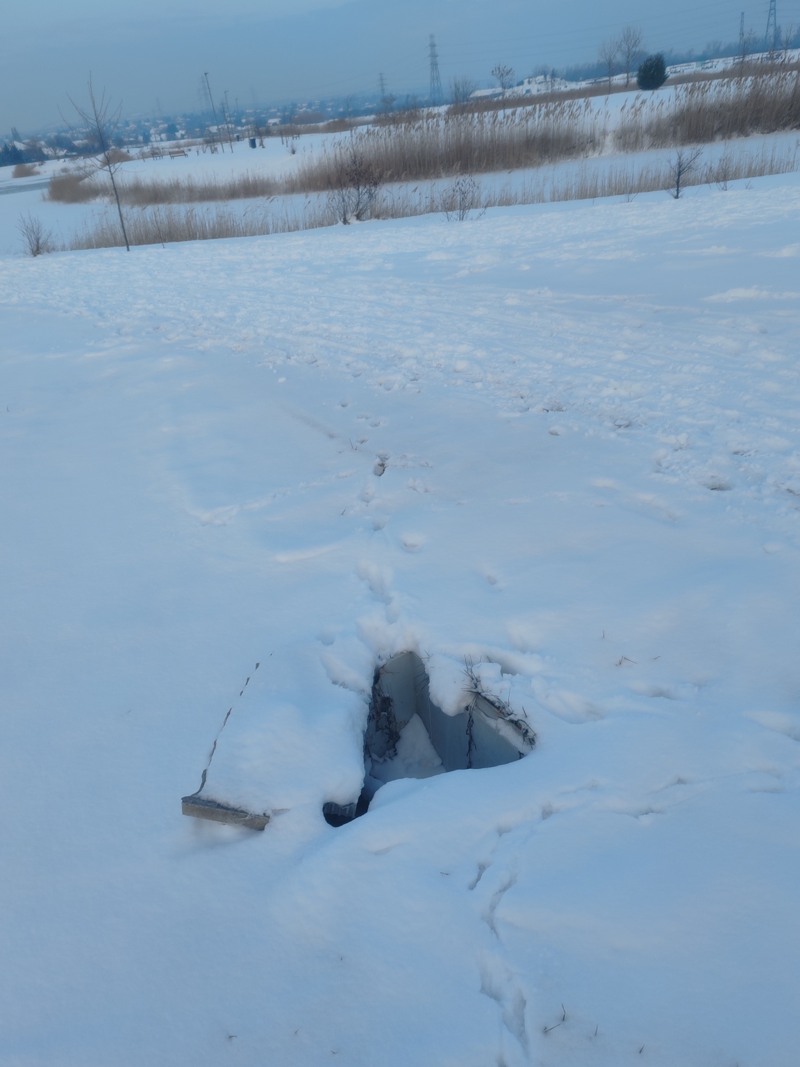 Félrecsúszott aknafedél hóval letakarva