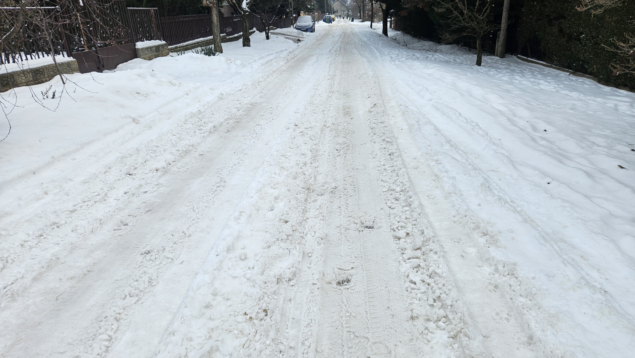A Berzsenyi Dániel utcában semmilyen hóeltakakarítás nem volt napok óta, most ráesett az ónos eső, mivel járda nincs, így gyalog nagyon veszélyesen járható.