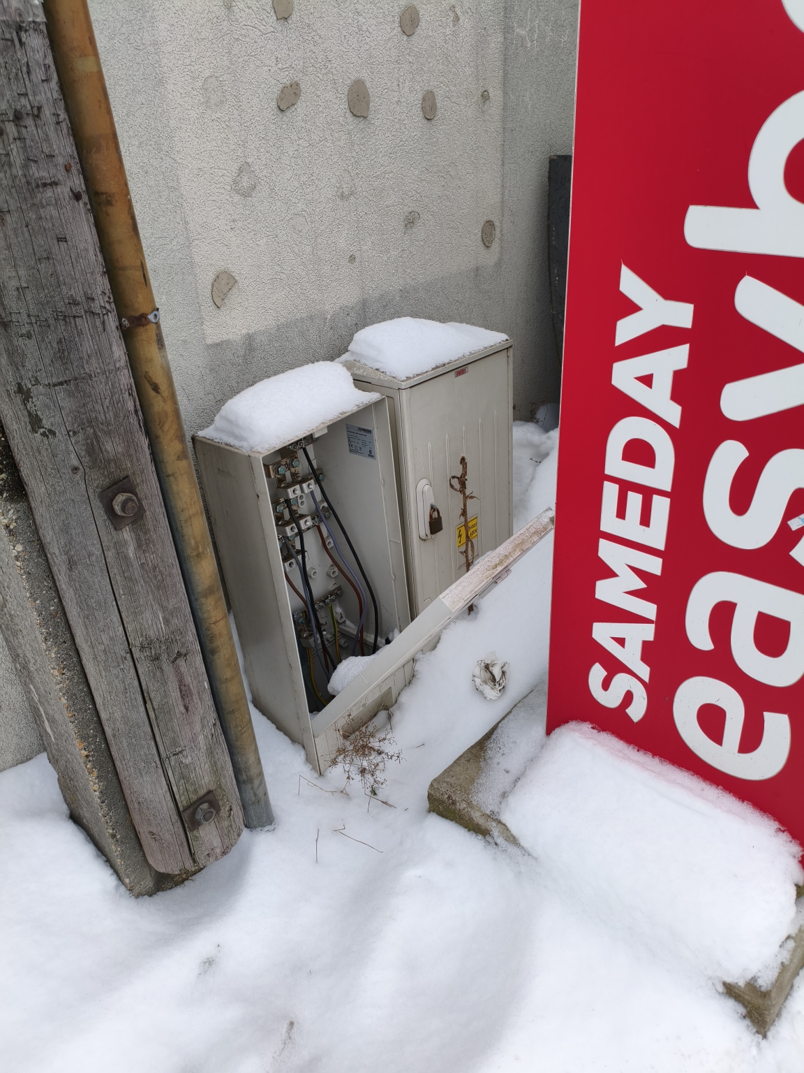A benzinkút mellett a sameday csomag automata mögött az elektromos kapcsoló szekrény ajtaja nyitott. Áram ütés veszély.