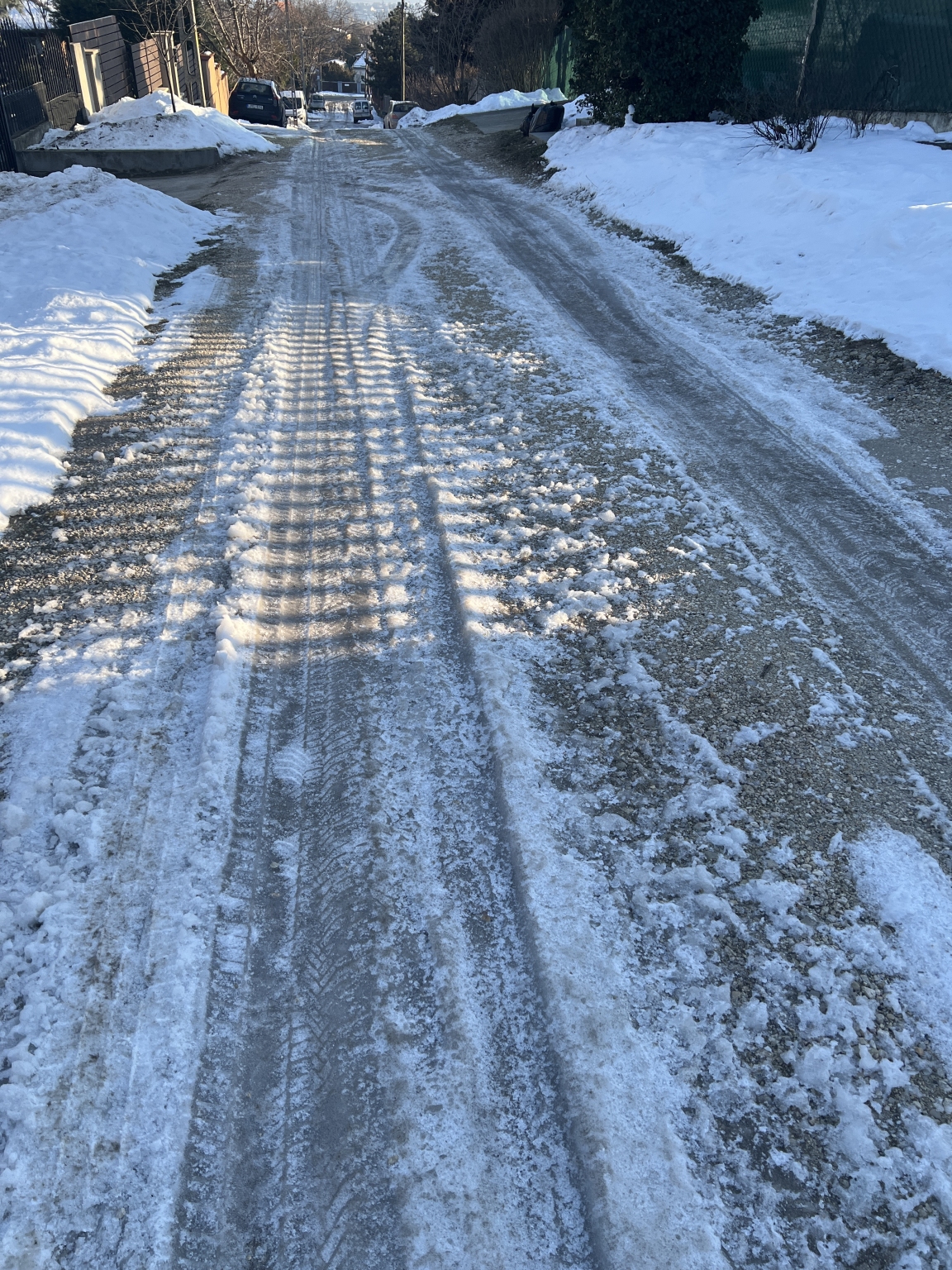 Érden a Tokaji utca egy elég meredek, dombos utca. Az utóbbi napokban jégpáncél borítja, sem autóval, sem gyalogosan nem lehet biztonságosan közlekedni rajta. Autóval a dombon felhajtani lehetetlen. Egy személy már elesett.